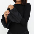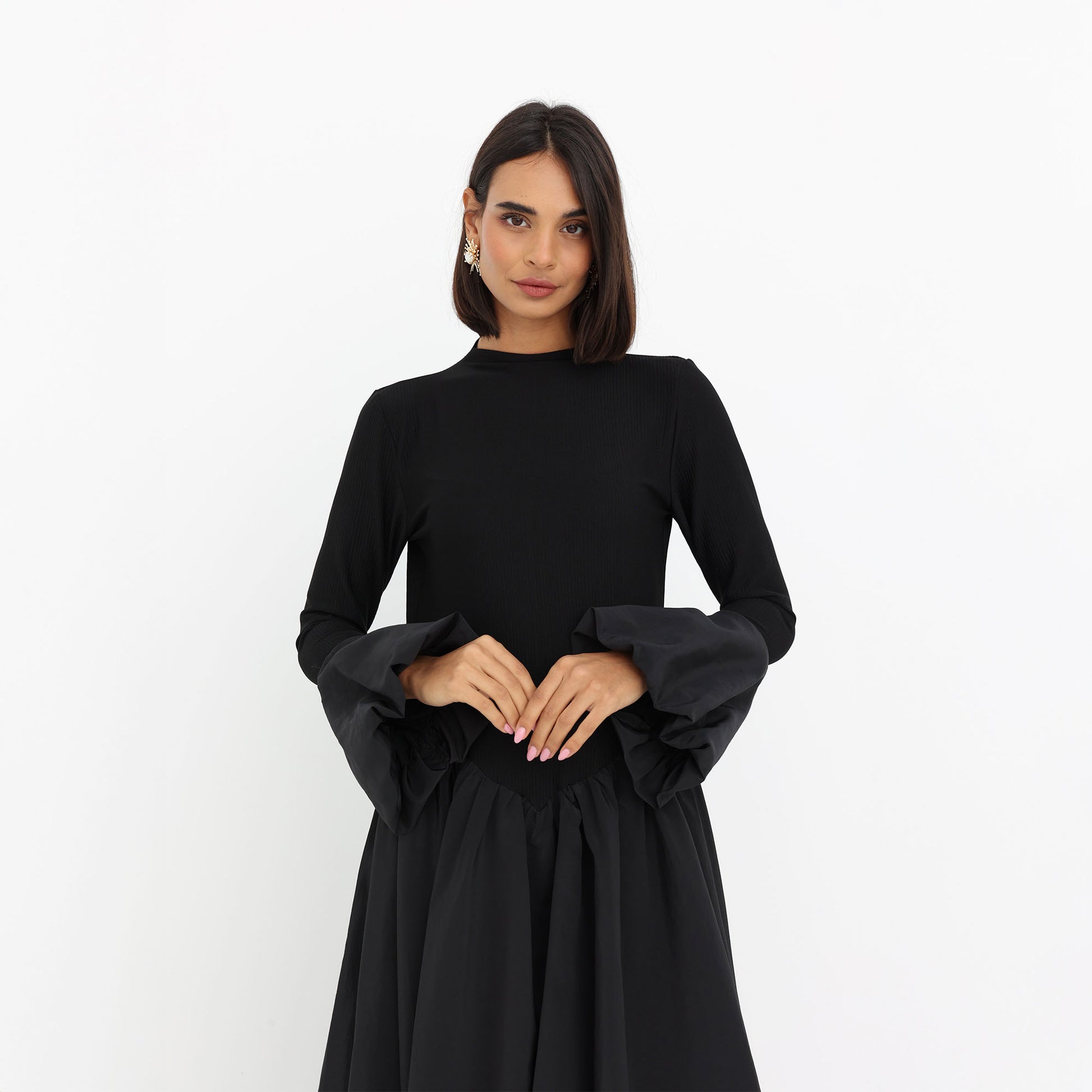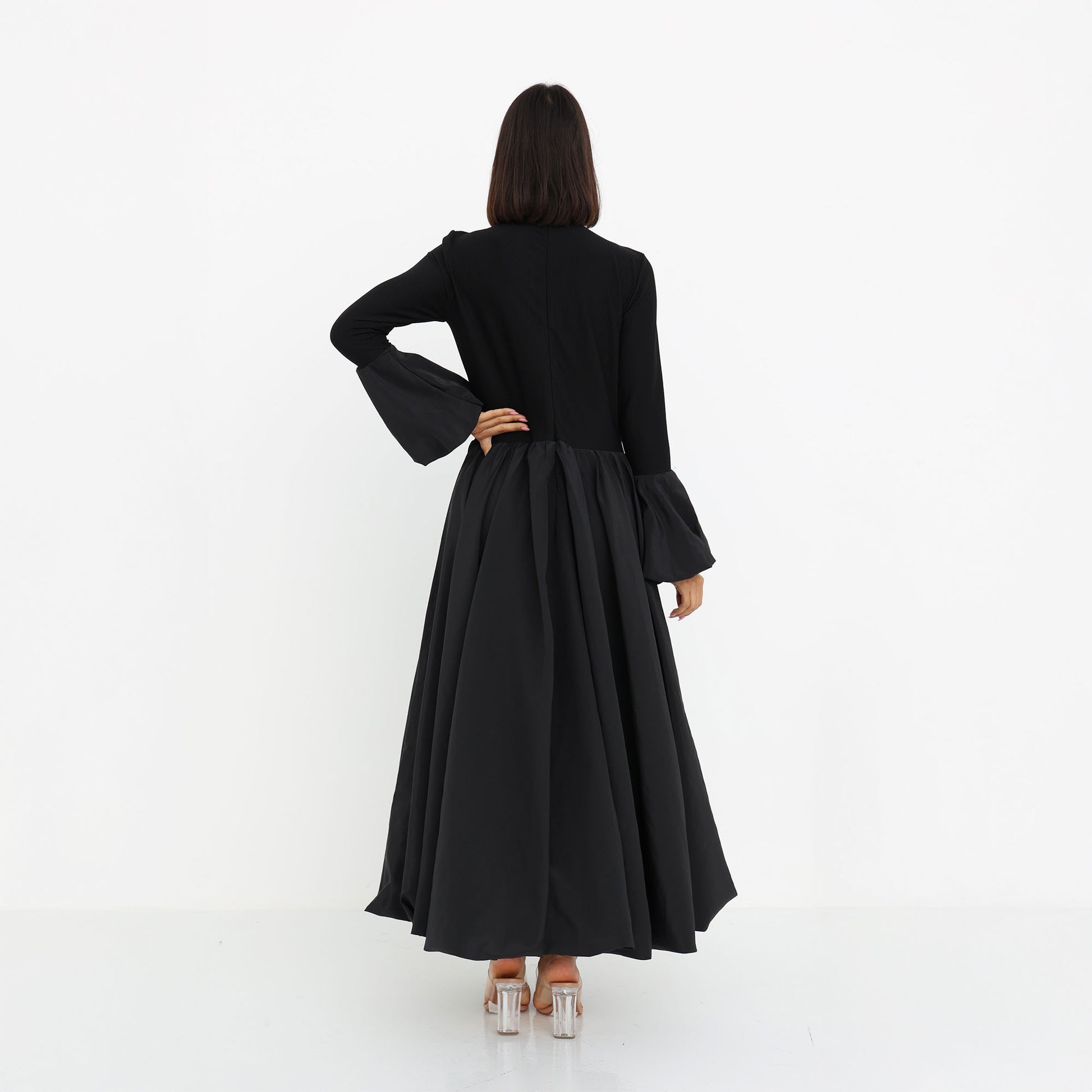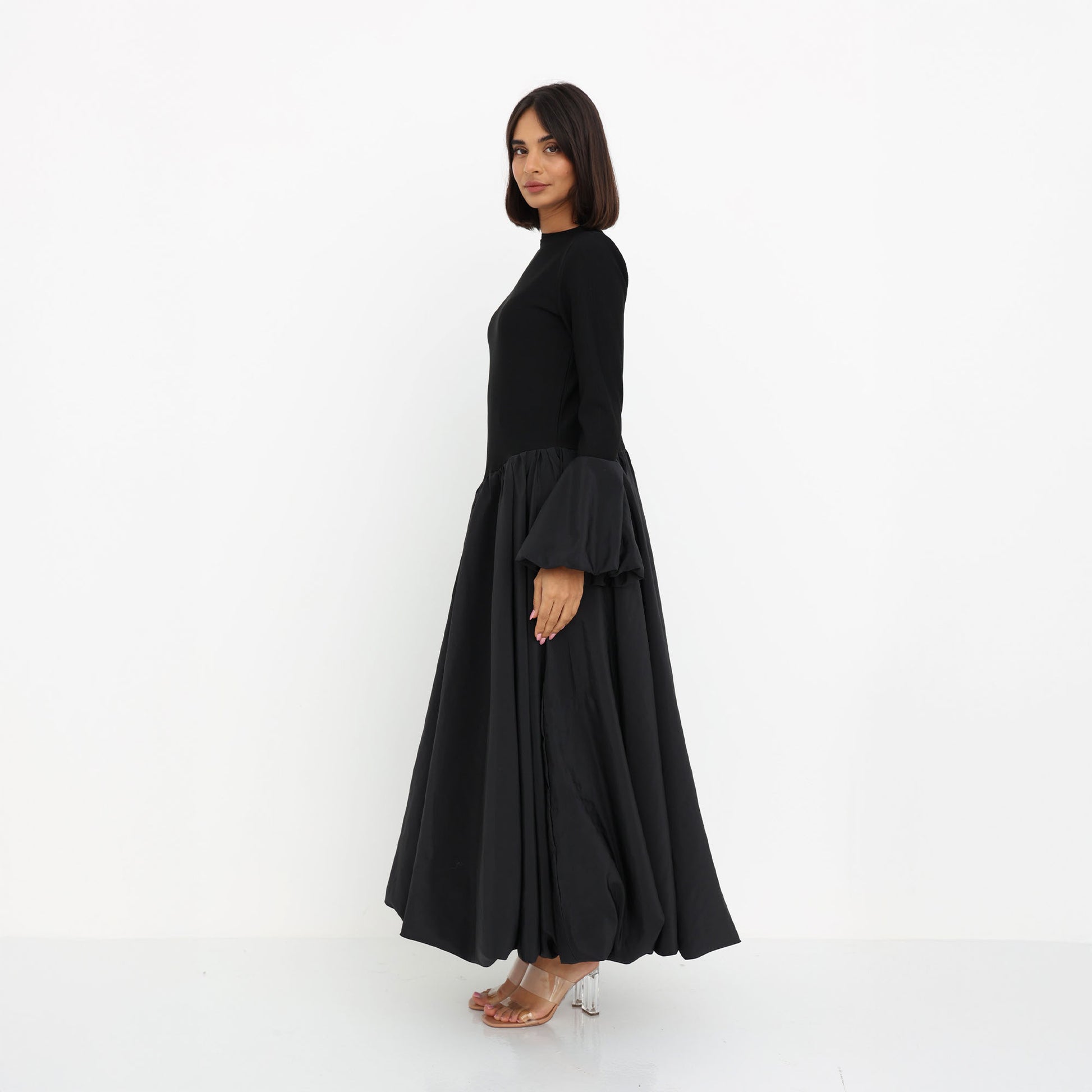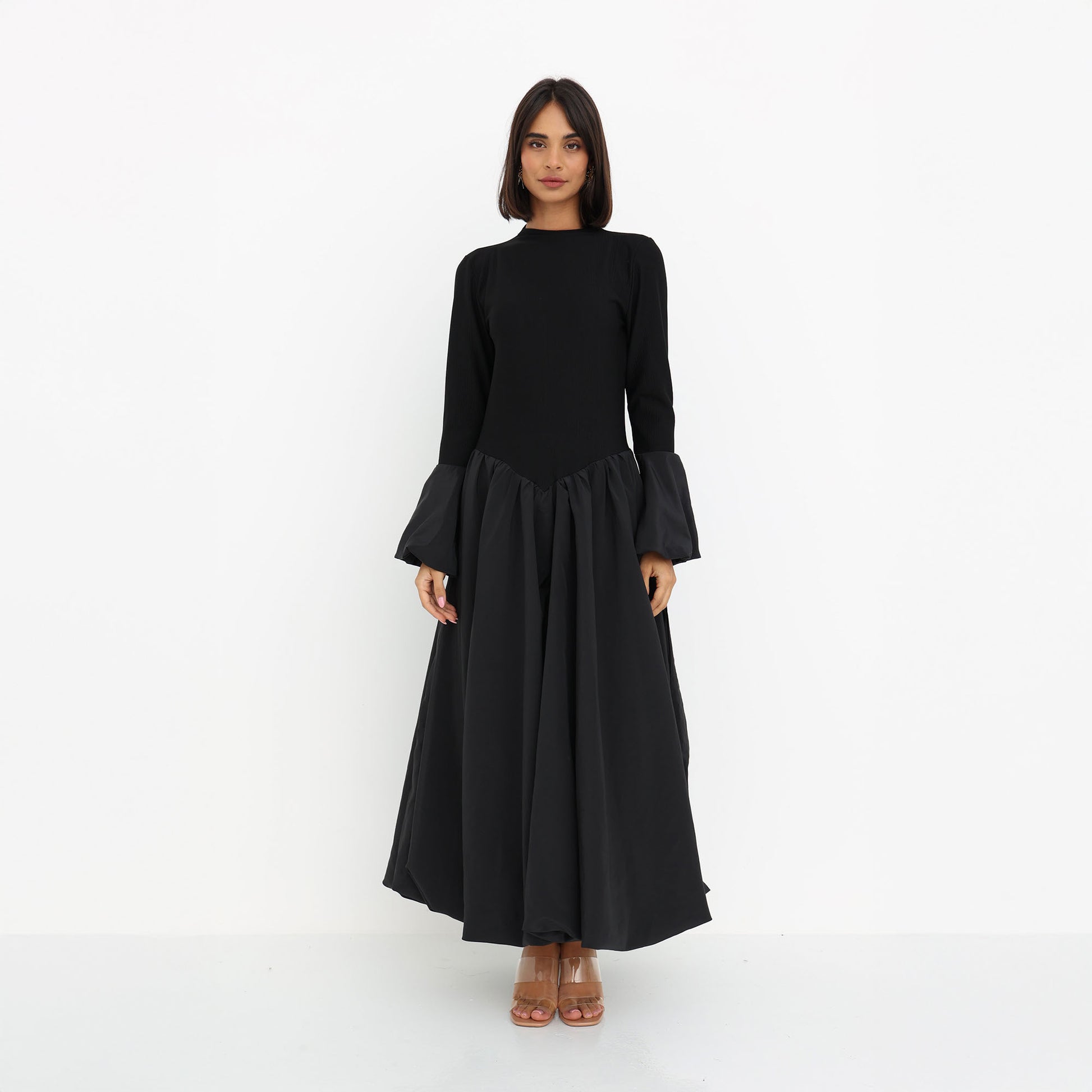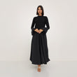 This elegant black dress is crafted from a luxurious combination of stretch cotton and Parachute fabric, offering both comfort and sophistication. The fitted bodice made from stretch cotton provides a sleek and structured silhouette, while the voluminous skirt and statement sleeves in lightweight Parachute fabric create a dramatic yet graceful flow. The fusion of textures adds a contemporary touch to this modest yet stylish ensemble, making it a versatile choice for both formal and semi-formal occasions.