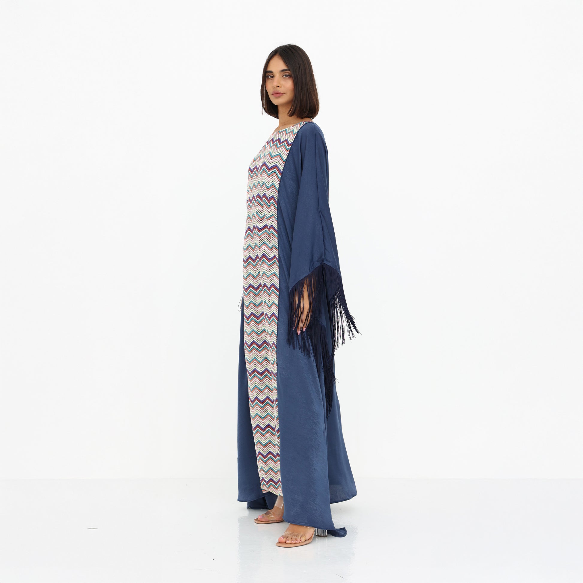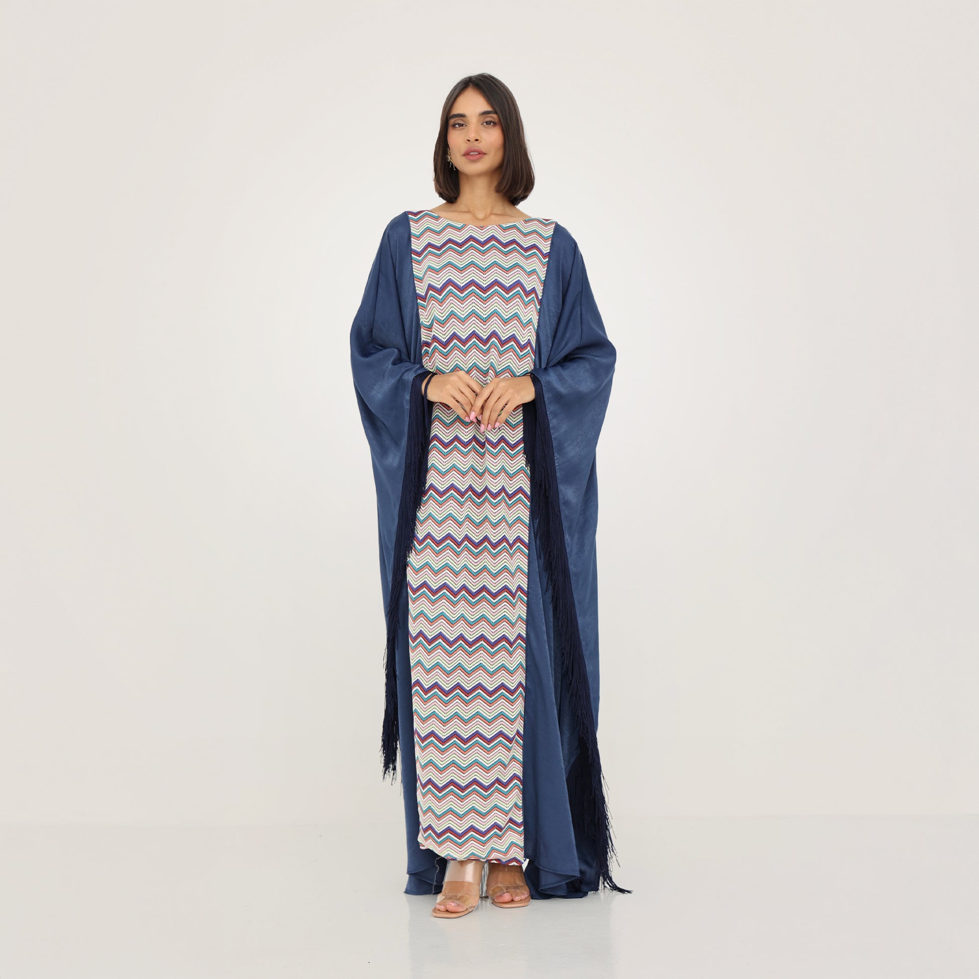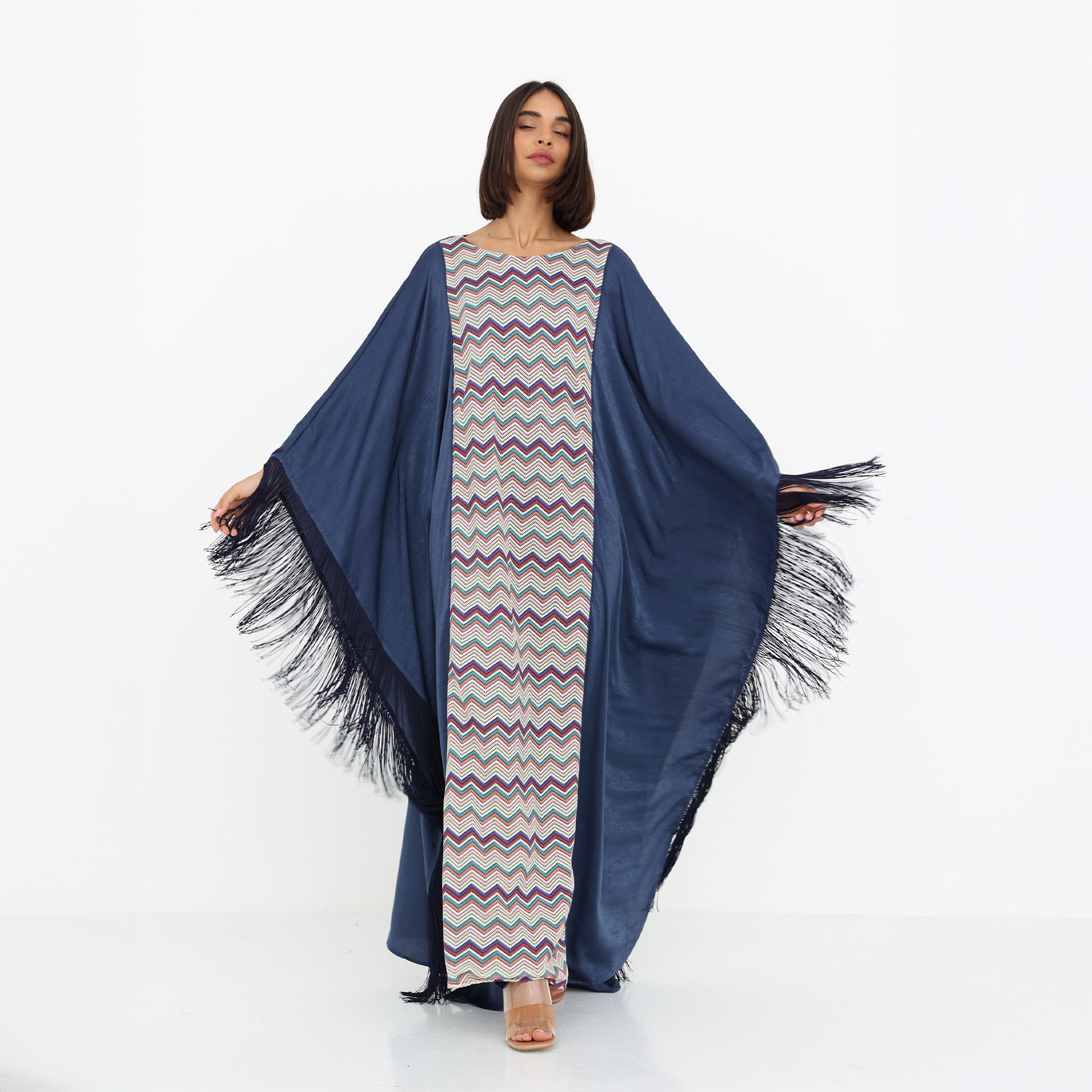 This stunning kaftan blends modern elegance with traditional charm. It features a striking chevron-patterned center panel in vibrant multicolored hues, adding a dynamic touch to the design. The flowing navy blue outer layer drapes gracefully, enhanced by dramatic fringed edges that bring movement and sophistication. With its loose, airy silhouette and bold yet refined aesthetic, this kaftan is perfect for special occasions, offering both comfort and high-end style.