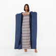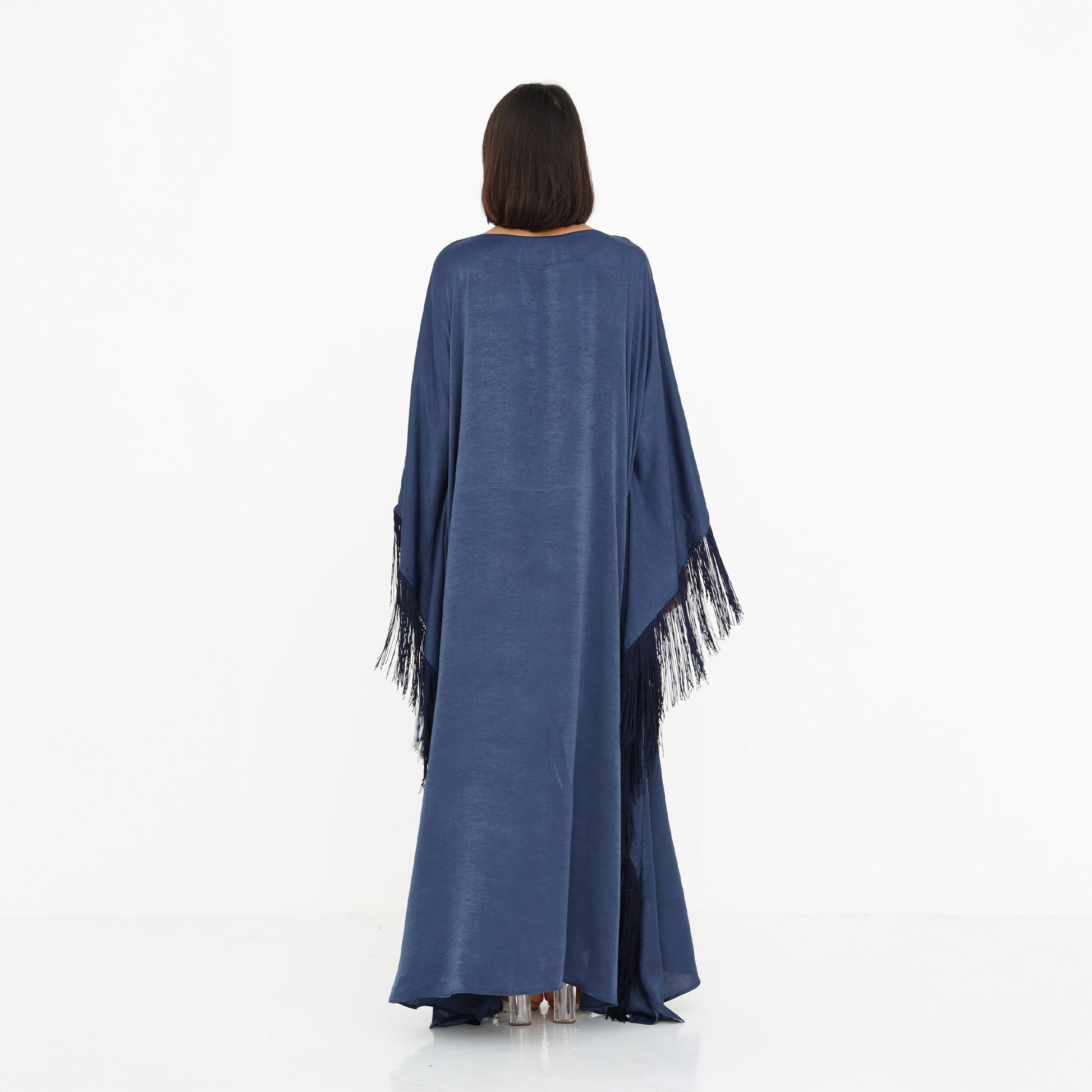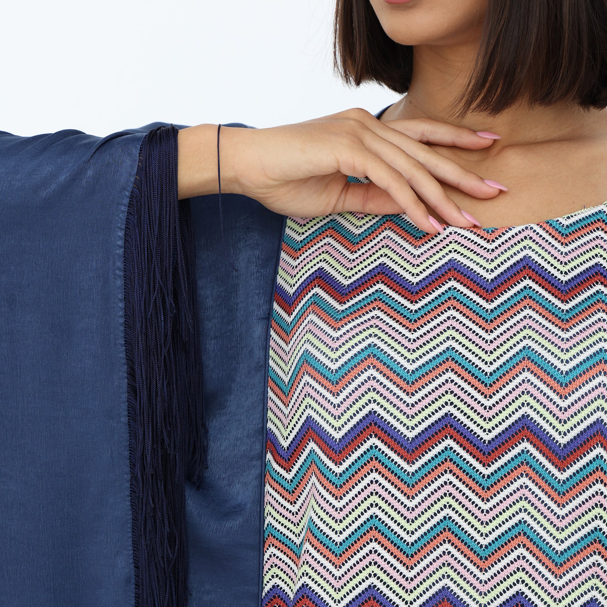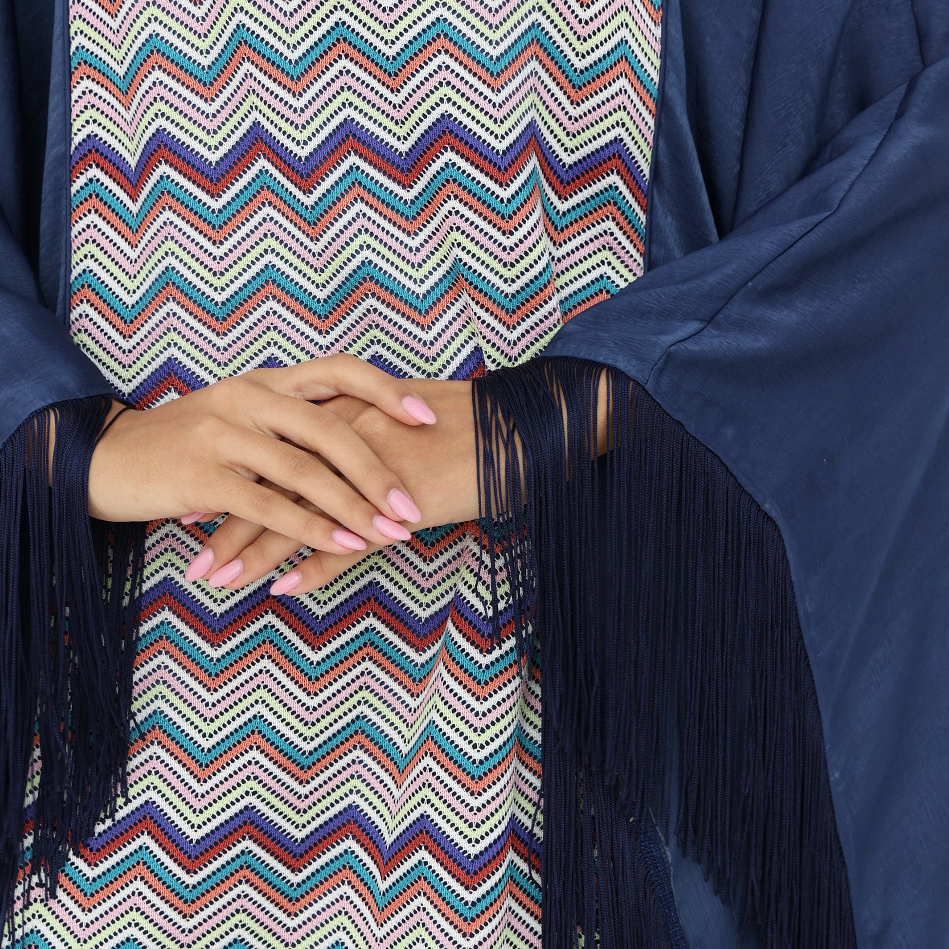 This stunning kaftan blends modern elegance with traditional charm. It features a striking chevron-patterned center panel in vibrant multicolored hues, adding a dynamic touch to the design. The flowing navy blue outer layer drapes gracefully, enhanced by dramatic fringed edges that bring movement and sophistication. With its loose, airy silhouette and bold yet refined aesthetic, this kaftan is perfect for special occasions, offering both comfort and high-end style.
