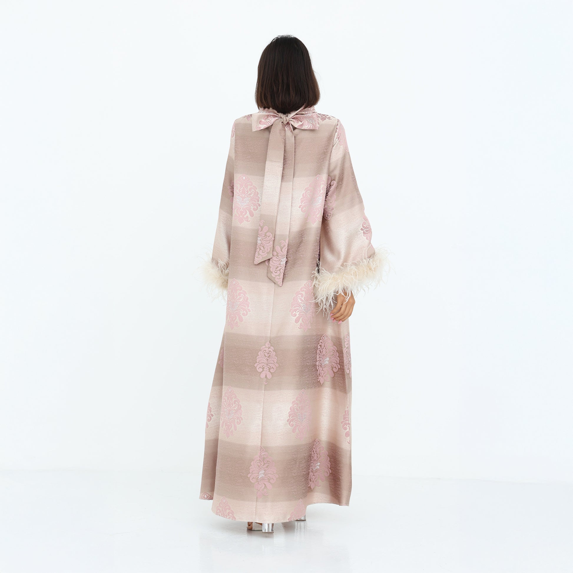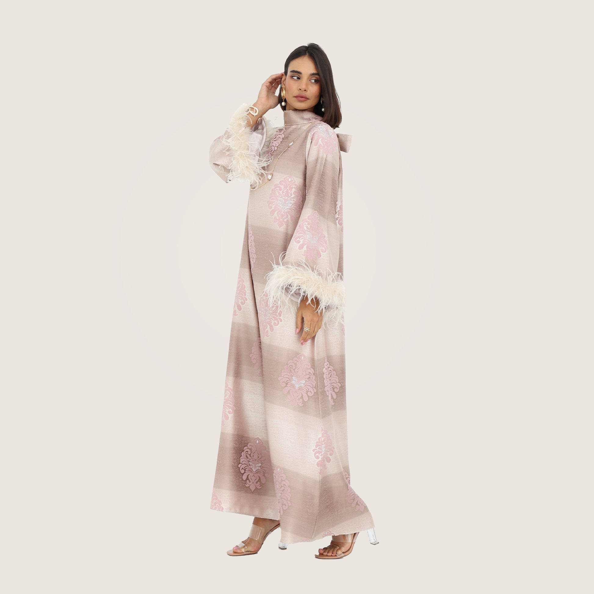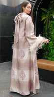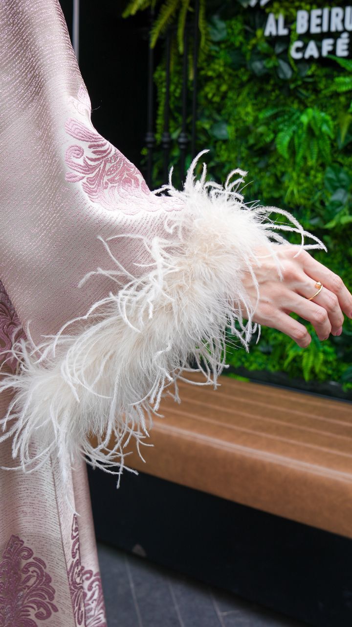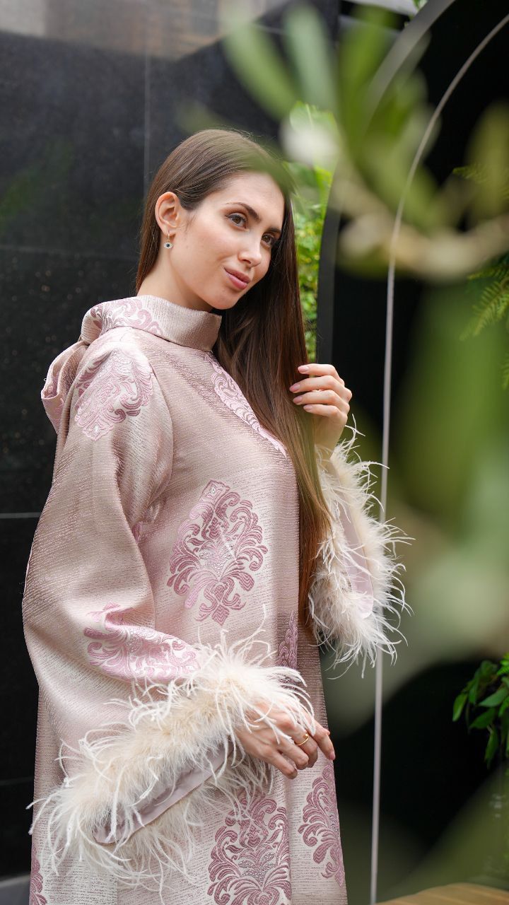 This elegant, full-length dress features a luxurious striped jacquard fabric in soft shades of blush and champagne. Delicate floral embroidery in pastel pink adds a touch of sophistication, while the wide sleeves are adorned with plush feather trims for a statement finish. The high neckline and subtle bow detail at the back enhance its graceful silhouette. Perfect for special occasions, this abaya exudes timeless glamour with a modern twist.