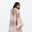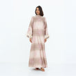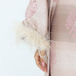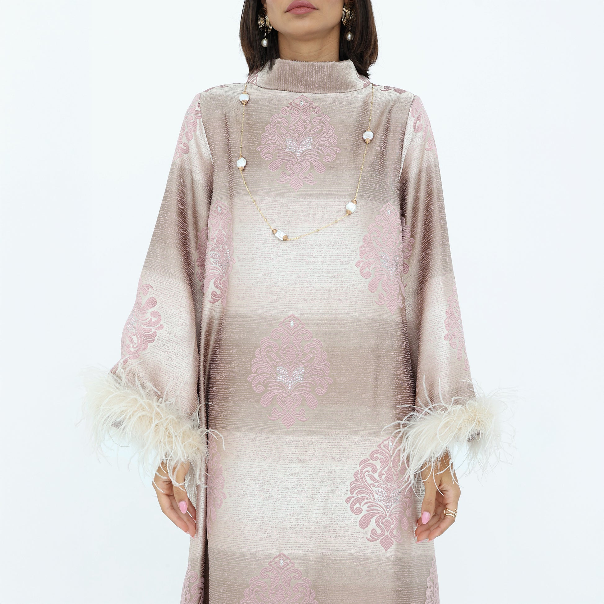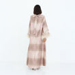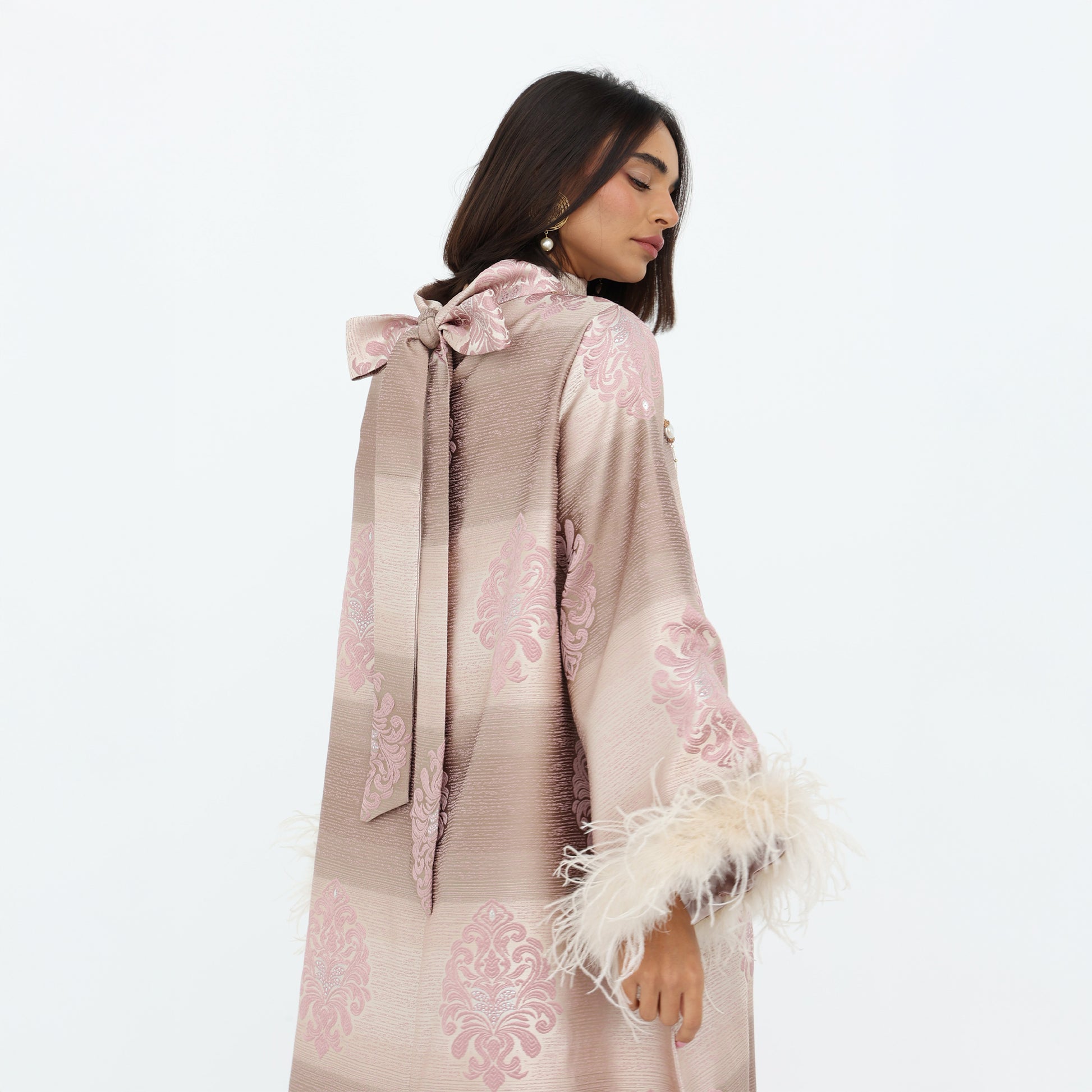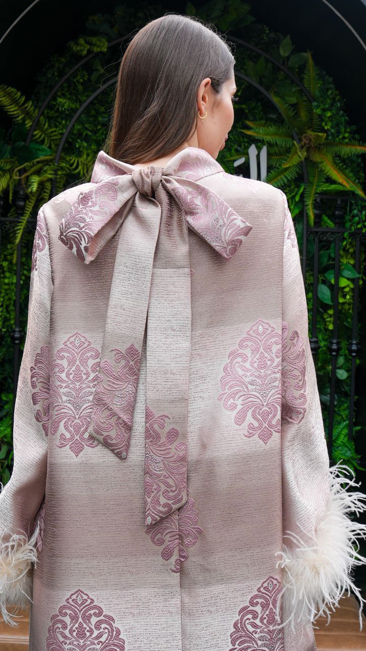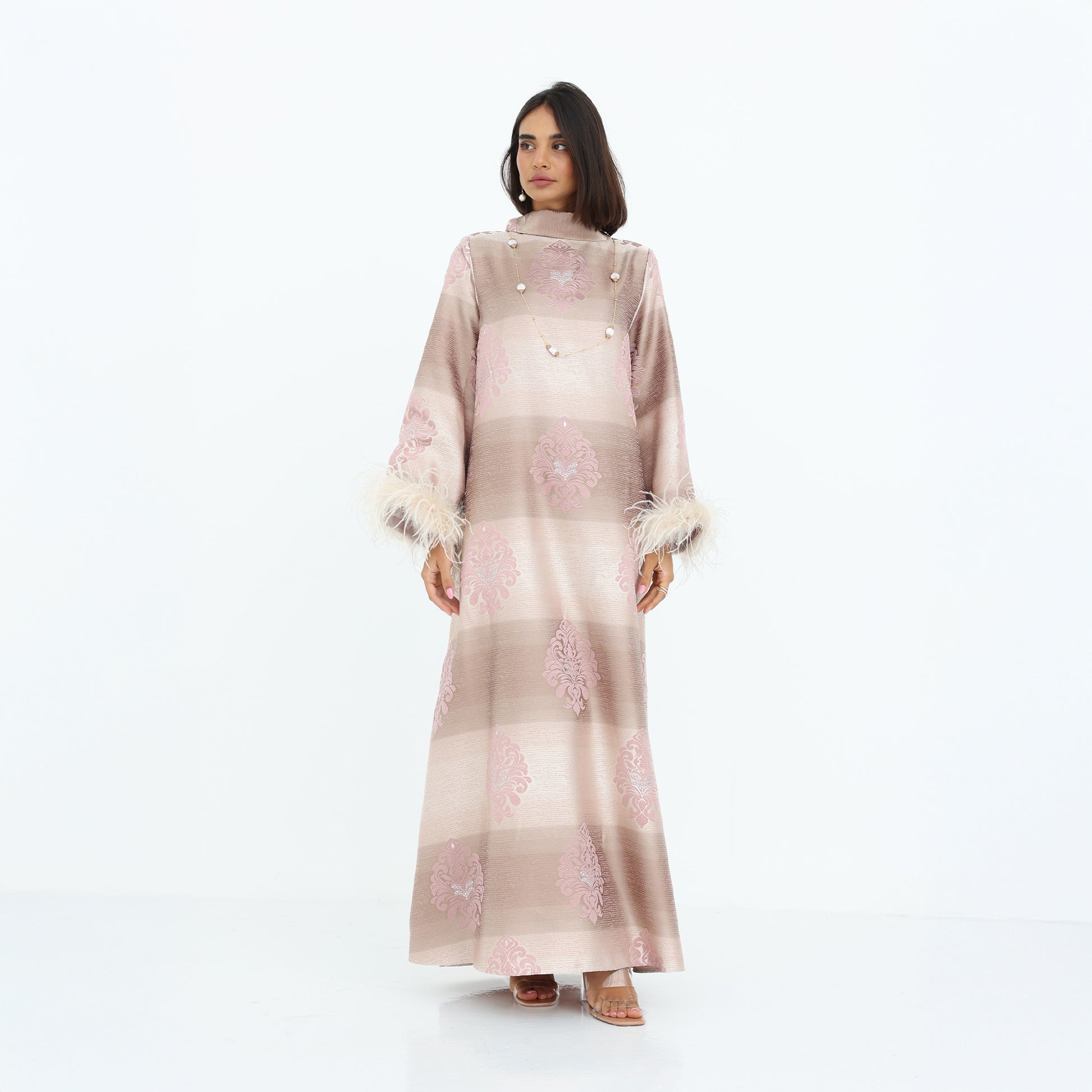 This elegant, full-length dress features a luxurious striped jacquard fabric in soft shades of blush and champagne. Delicate floral embroidery in pastel pink adds a touch of sophistication, while the wide sleeves are adorned with plush feather trims for a statement finish. The high neckline and subtle bow detail at the back enhance its graceful silhouette. Perfect for special occasions, this abaya exudes timeless glamour with a modern twist.
