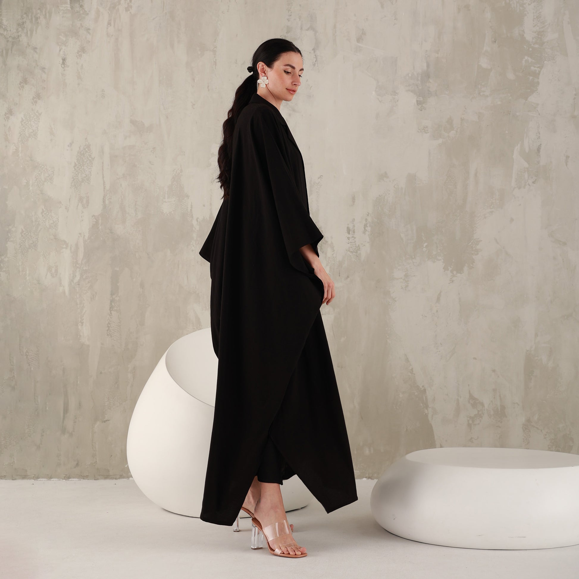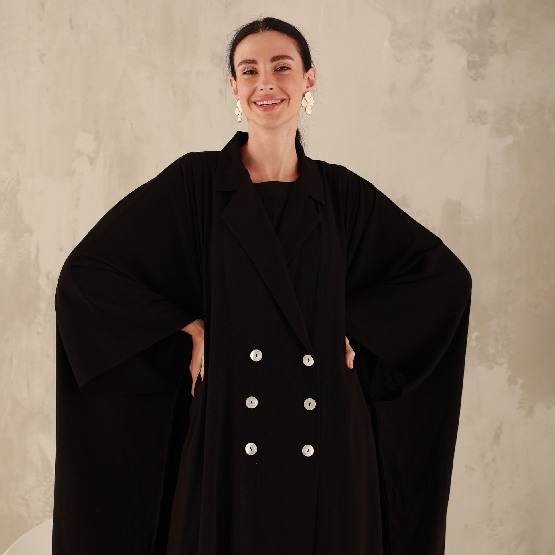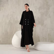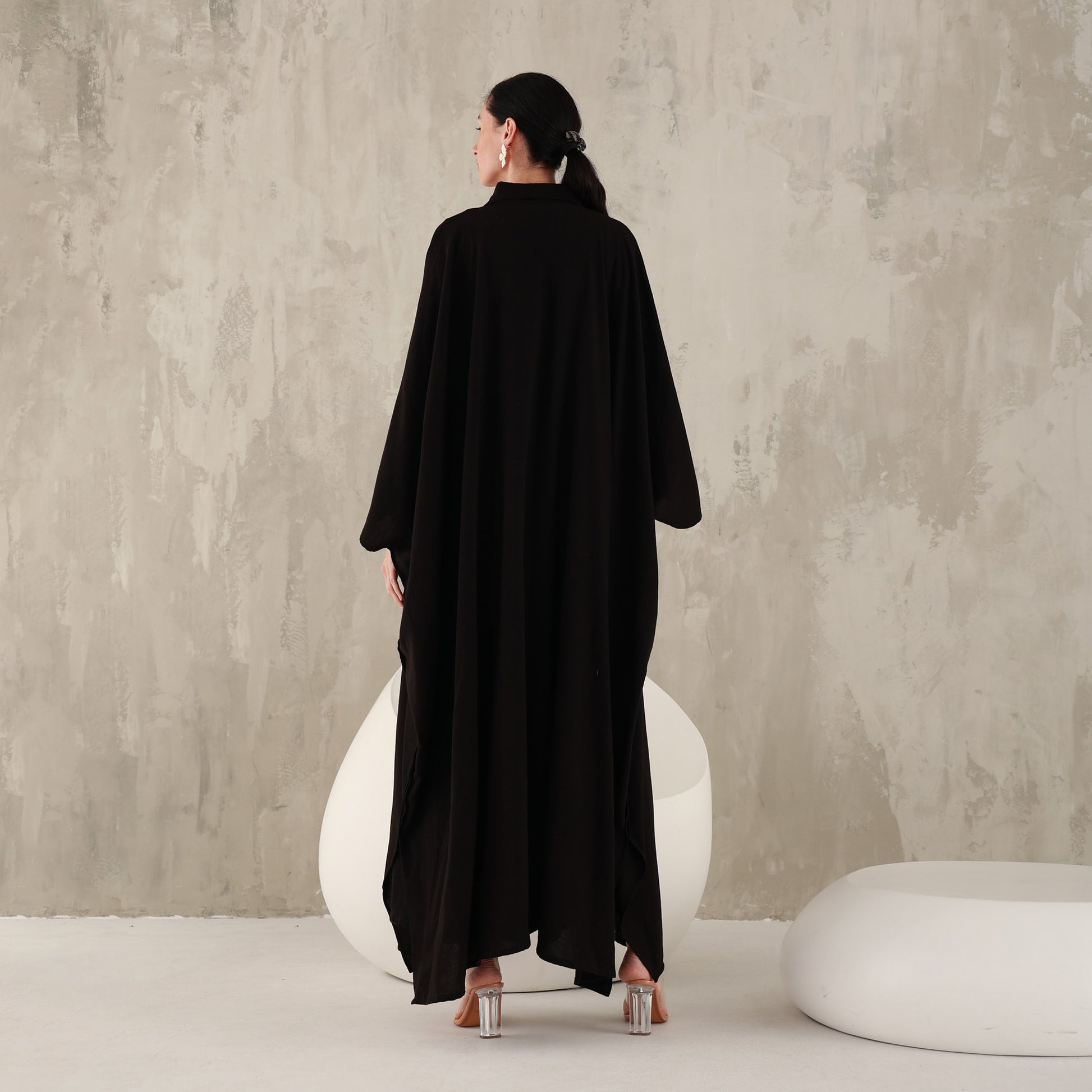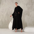This is a luxurious abaya crafted from 100% Ketan fabric, featuring an elegant butterfly cut. The design exudes sophistication with a flowing silhouette and wide sleeves, creating a dramatic and graceful look. The abaya is adorned with classic buttons on the front, adding a subtle yet stylish detail that enhances its refined appeal. Perfect for formal occasions or adding a touch of elegance to everyday wear.