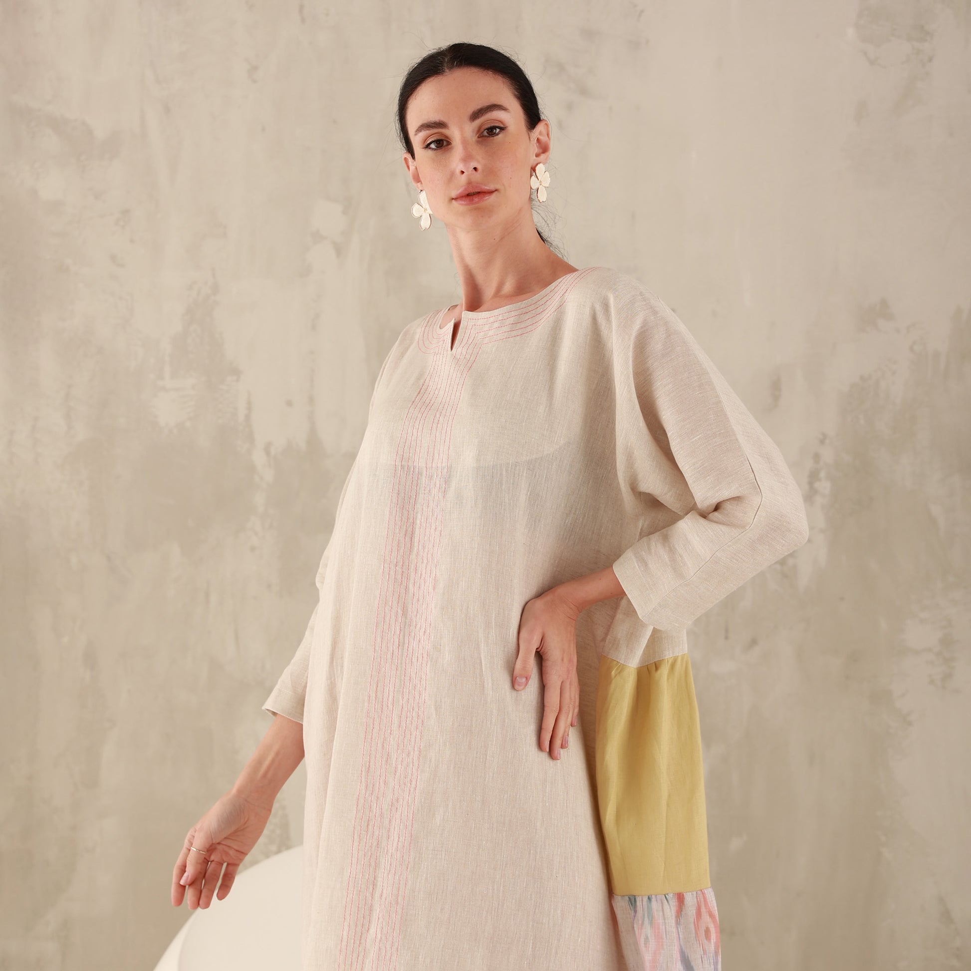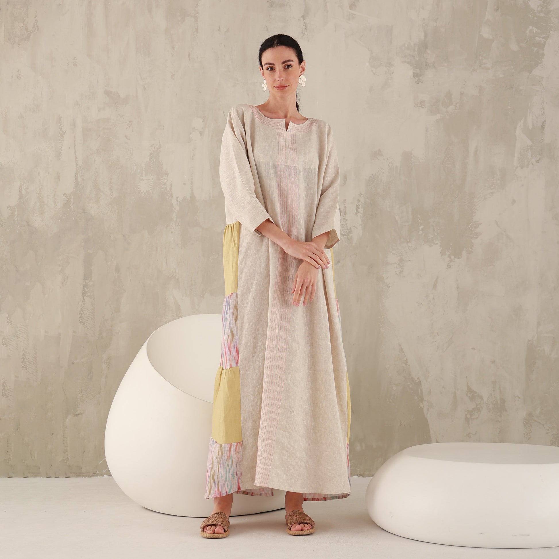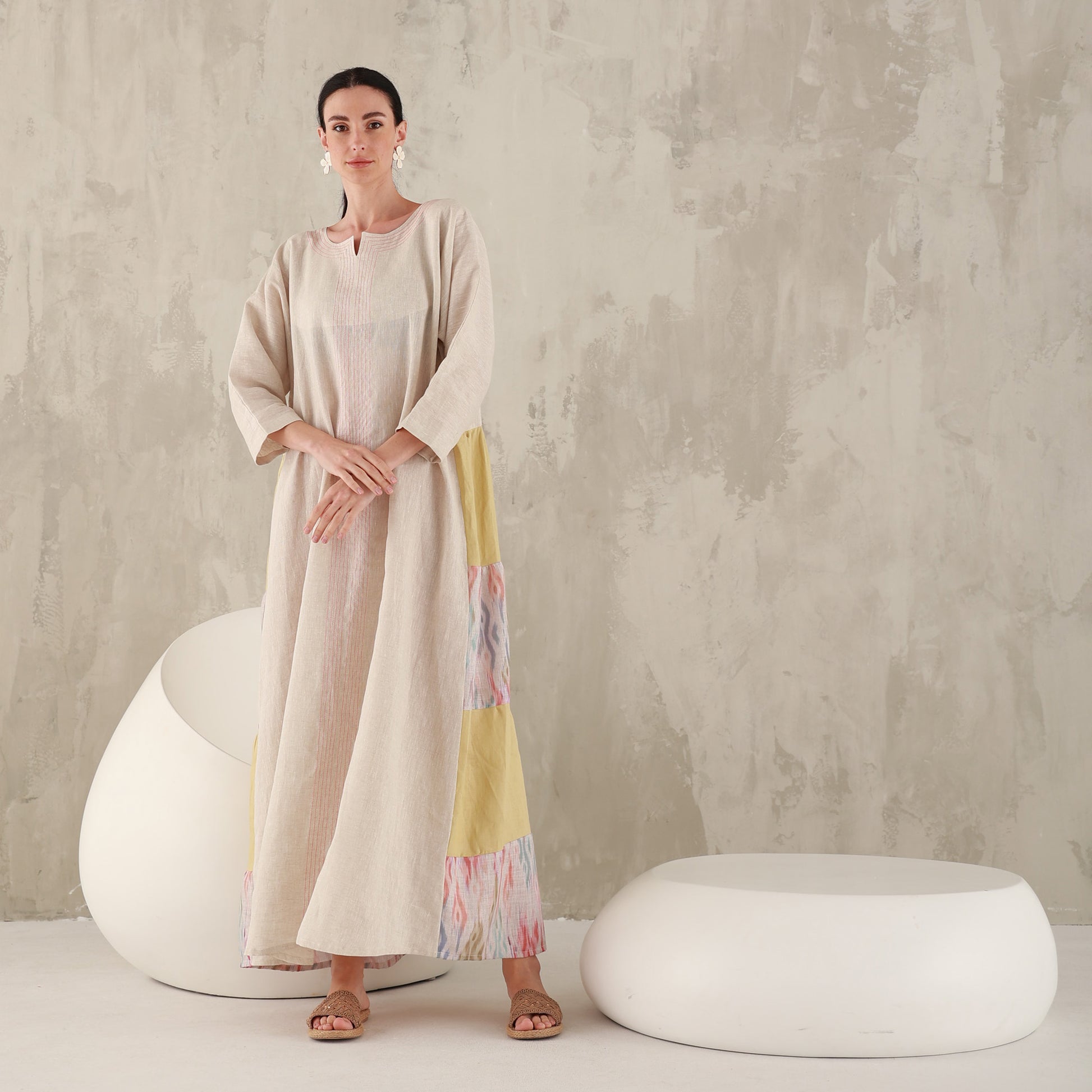 Overall, this dress is perfect for those who want to look chic and stylish while still feeling comfortable and relaxed. The linen fabric is soft and breathable, which means you can wear it all day without feeling too hot or stuffy. Plus, the unique design and mix of colors make it a great choice for any occasion.