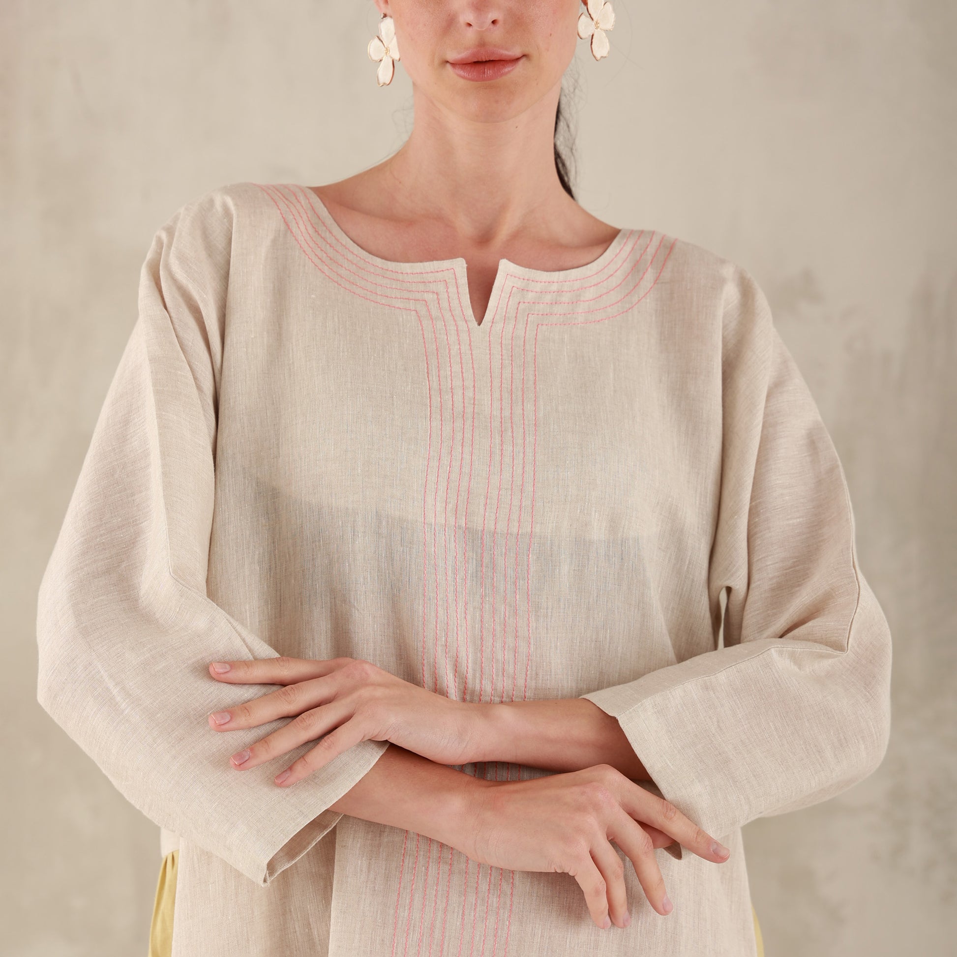 Ayla linen dress features a special design on the back that really sets it apart from other dresses. The mix of colors is also a nice touch, adding some beautiful visual interest to the dress.