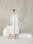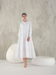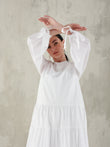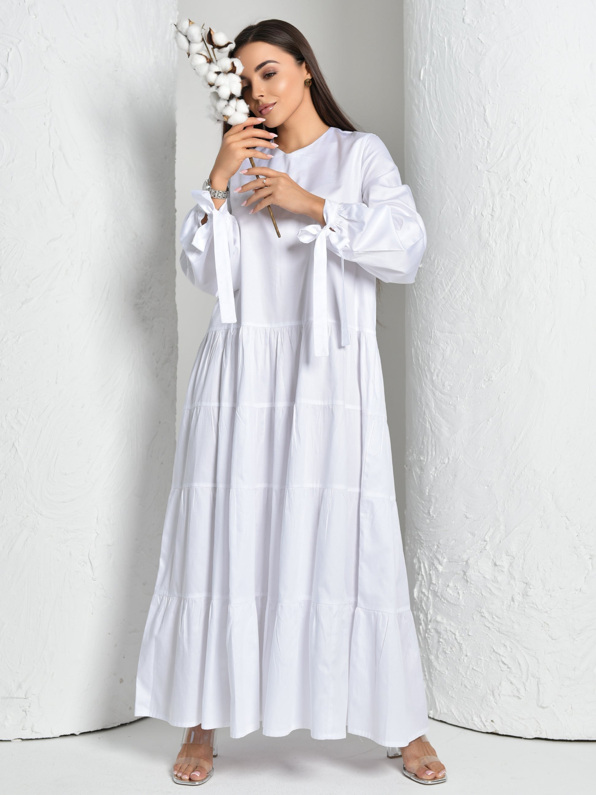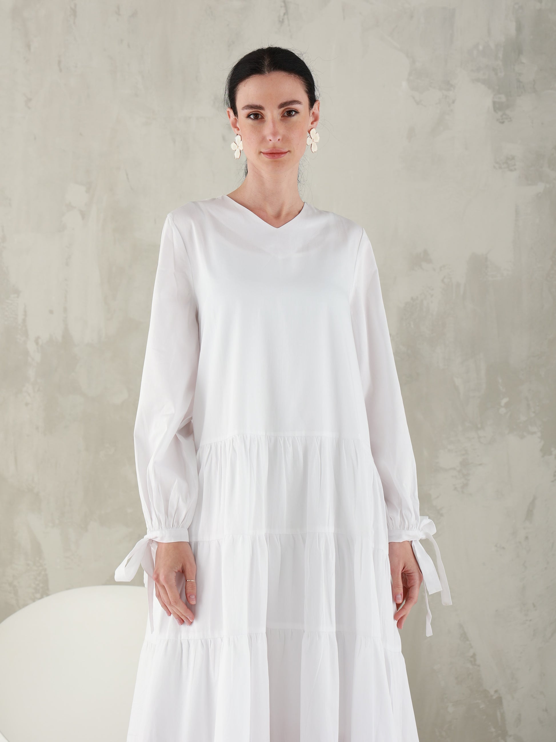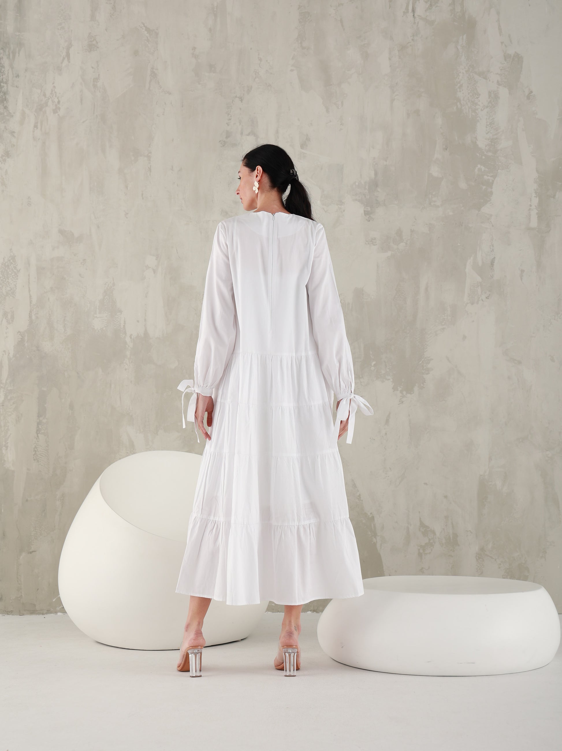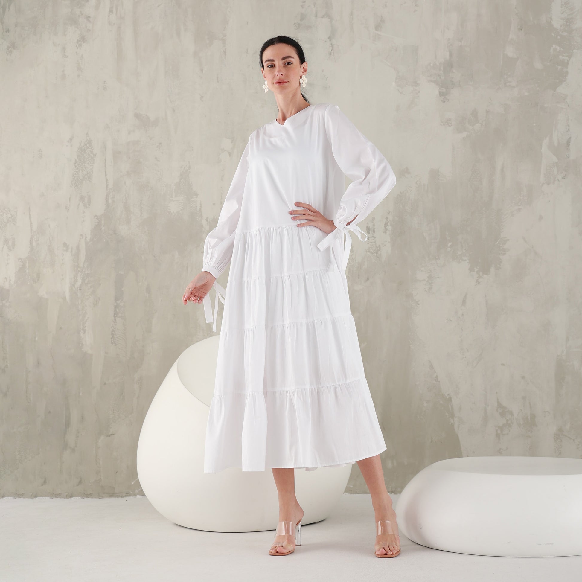 Riviera Dress represents relaxed, laidback femininity with effortless styling. Tailored from cotton, the multi-tiered dress has a soft feel and breathable finish for hot summer days. Its wrist cuffs with ribbon give a practical, smart-casual appeal. Match it with high heels or white sport shoos.