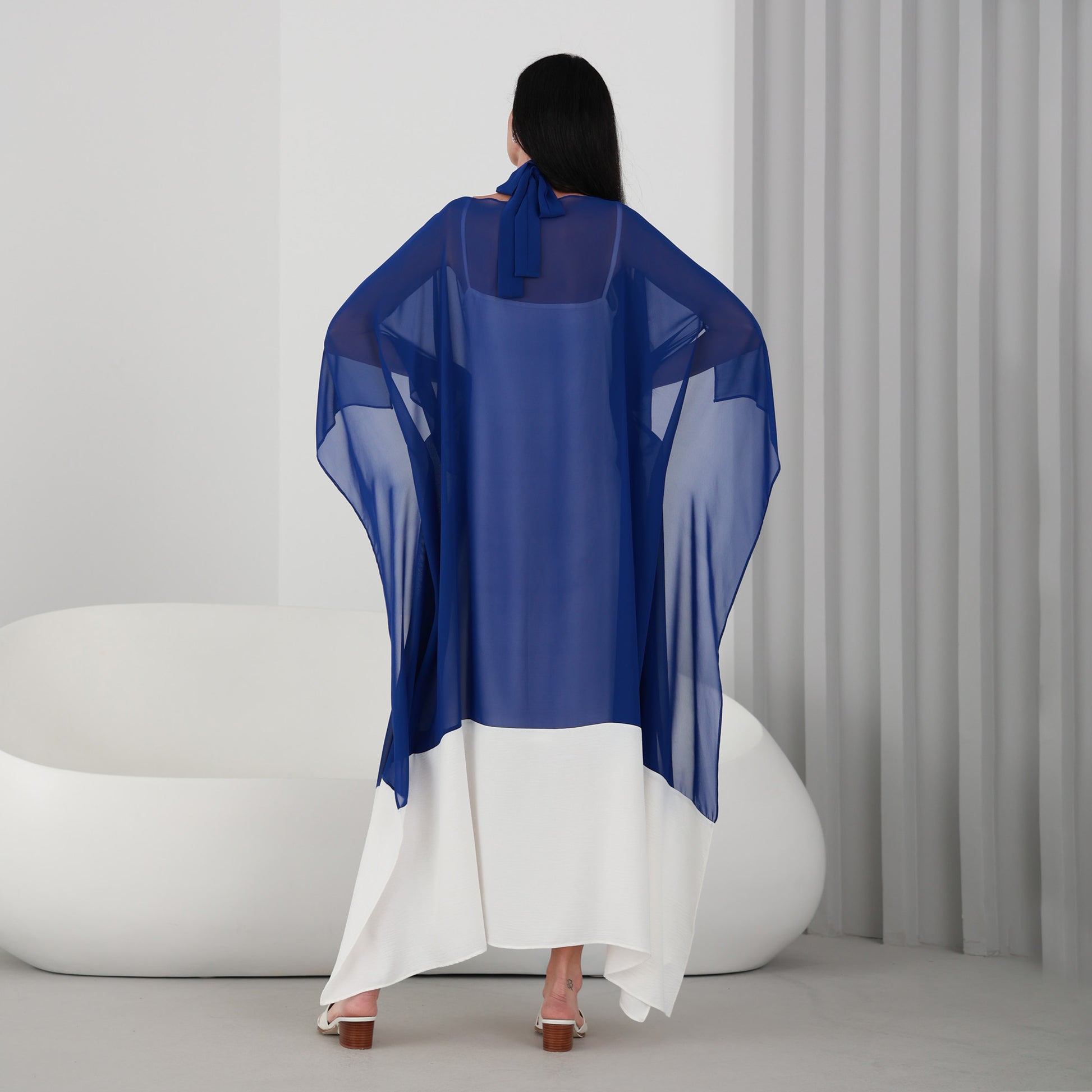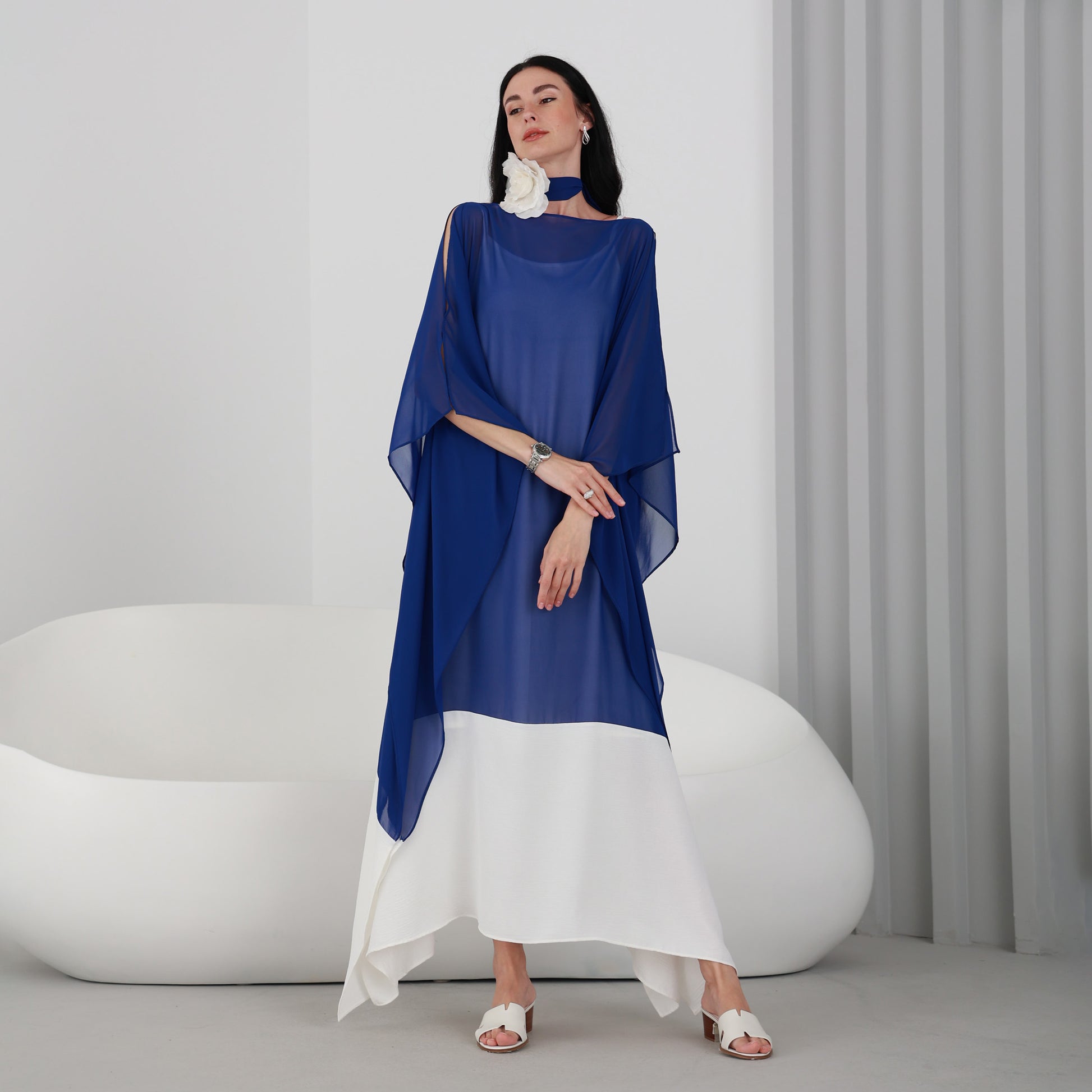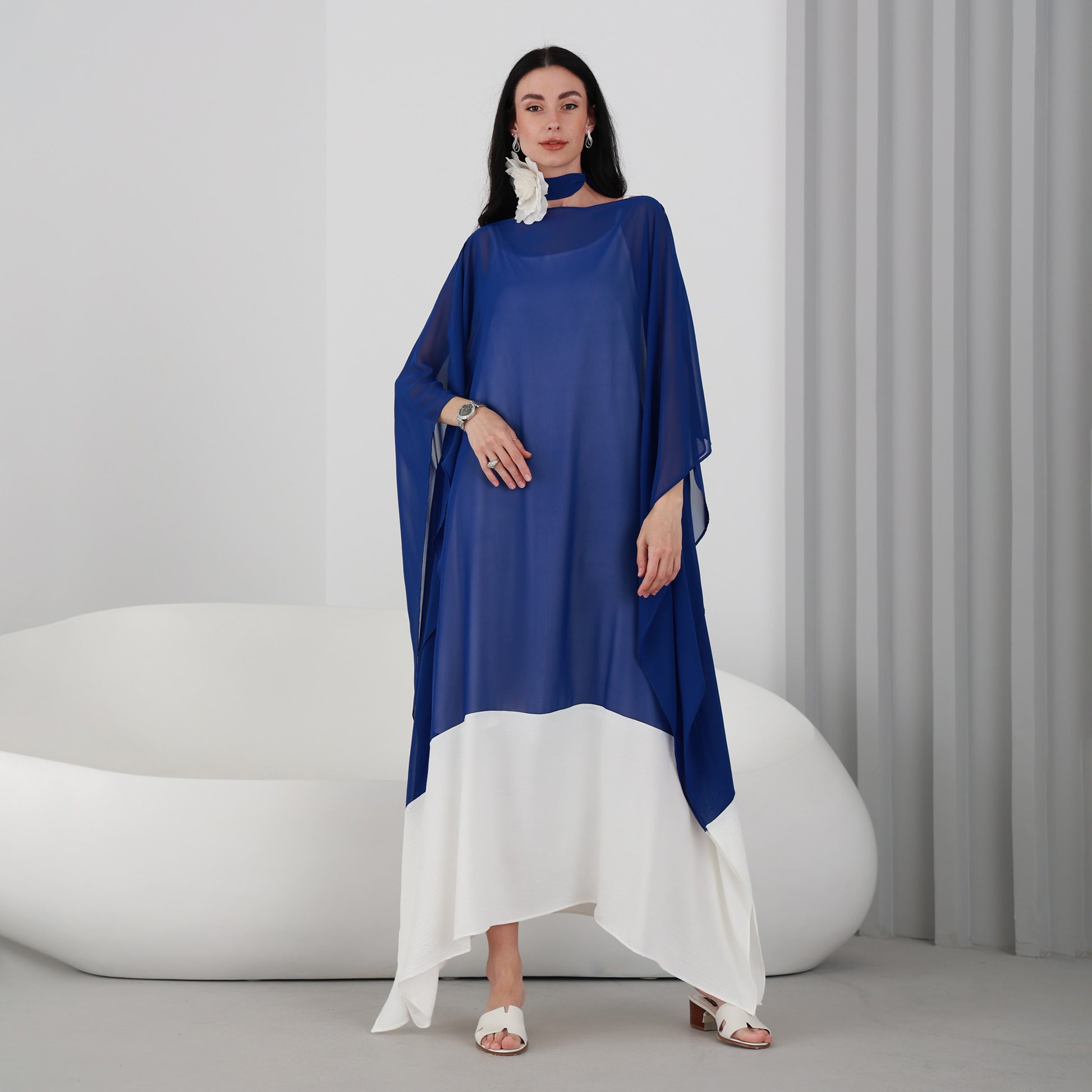 Lili Kaftan is a stunning piece that is perfect for any occasion. This kaftan dress features a beautiful Royal Blue chiffon fabric that flows gracefully as you move. The dress comes with an attached under dress to ensure full coverage.