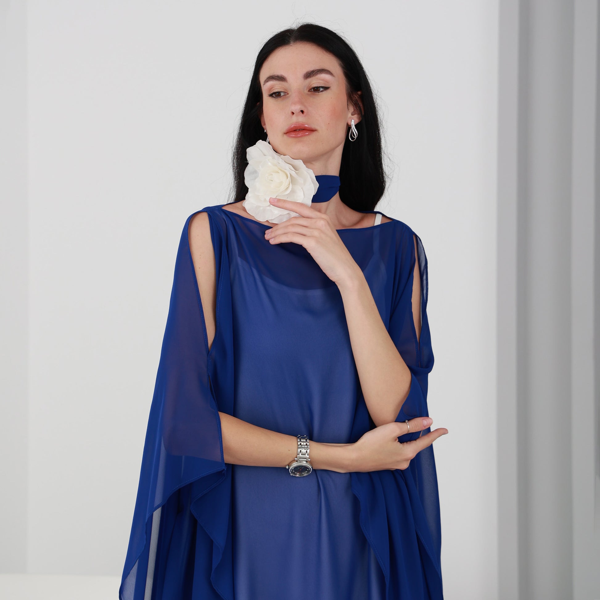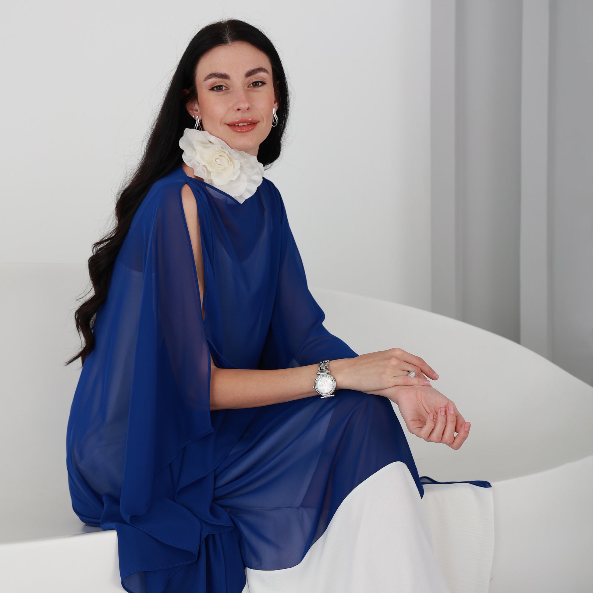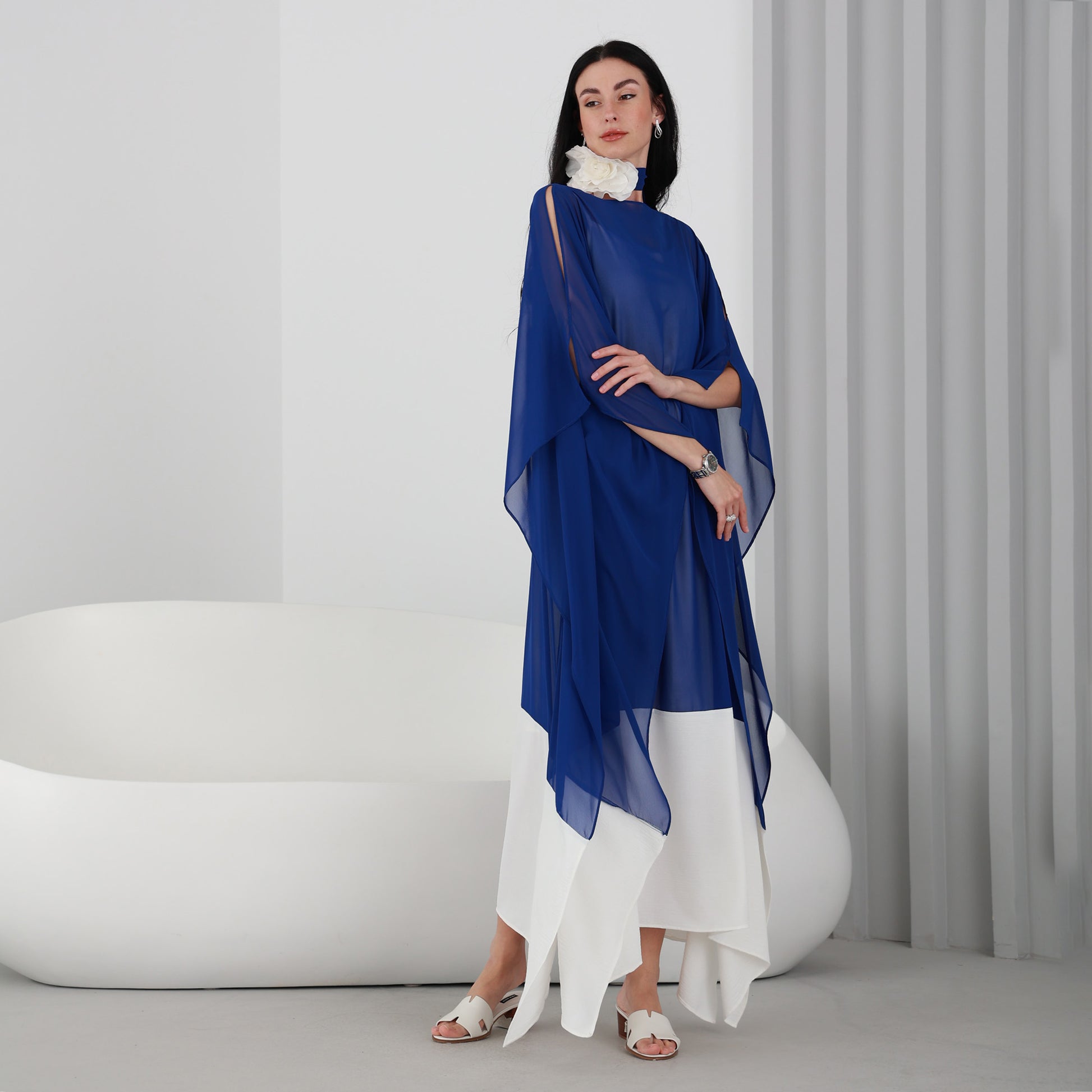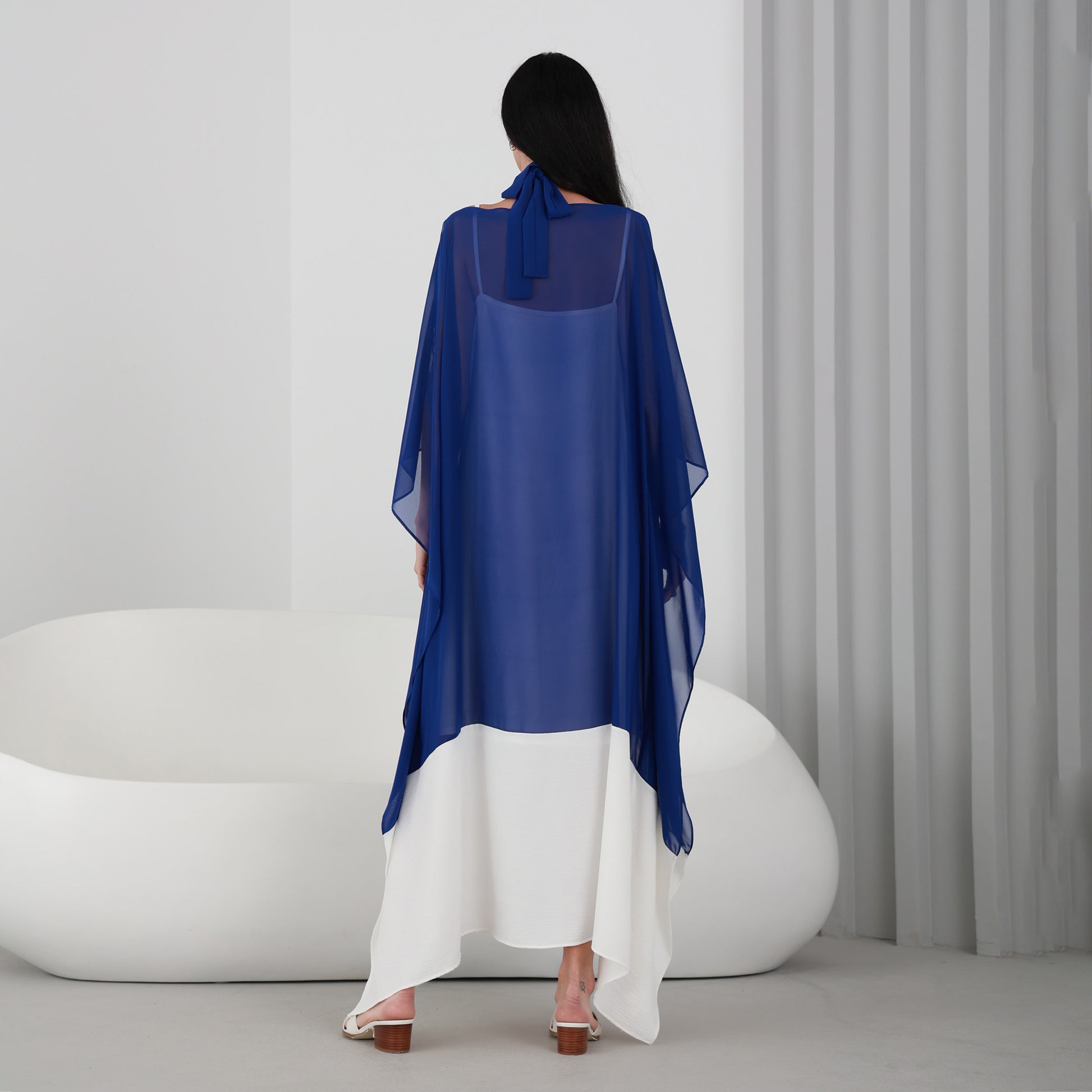 Lili Kaftan is a stunning piece that is perfect for any occasion. This kaftan dress features a beautiful Royal Blue chiffon fabric that flows gracefully as you move. The dress comes with an attached under dress to ensure full coverage.