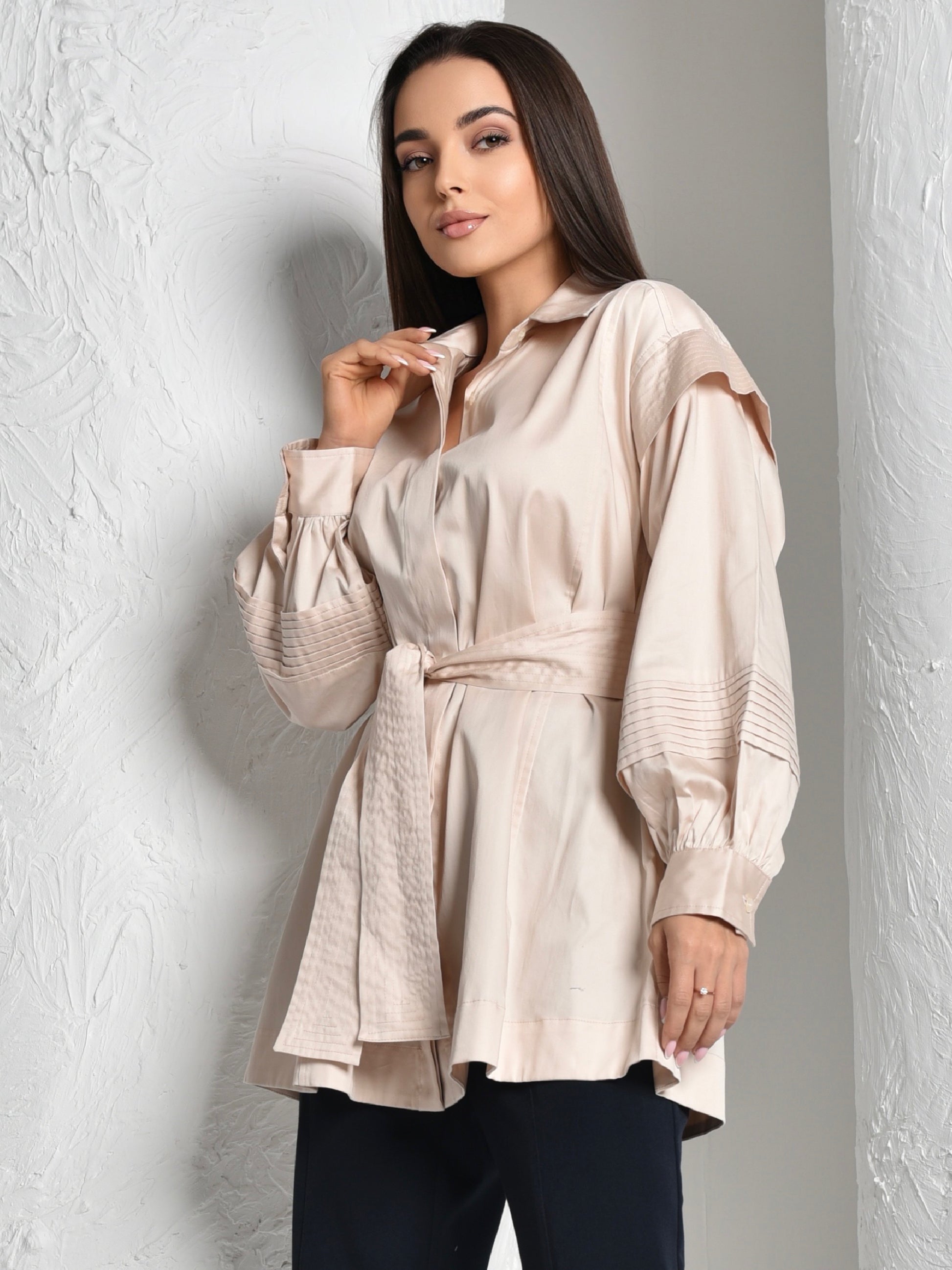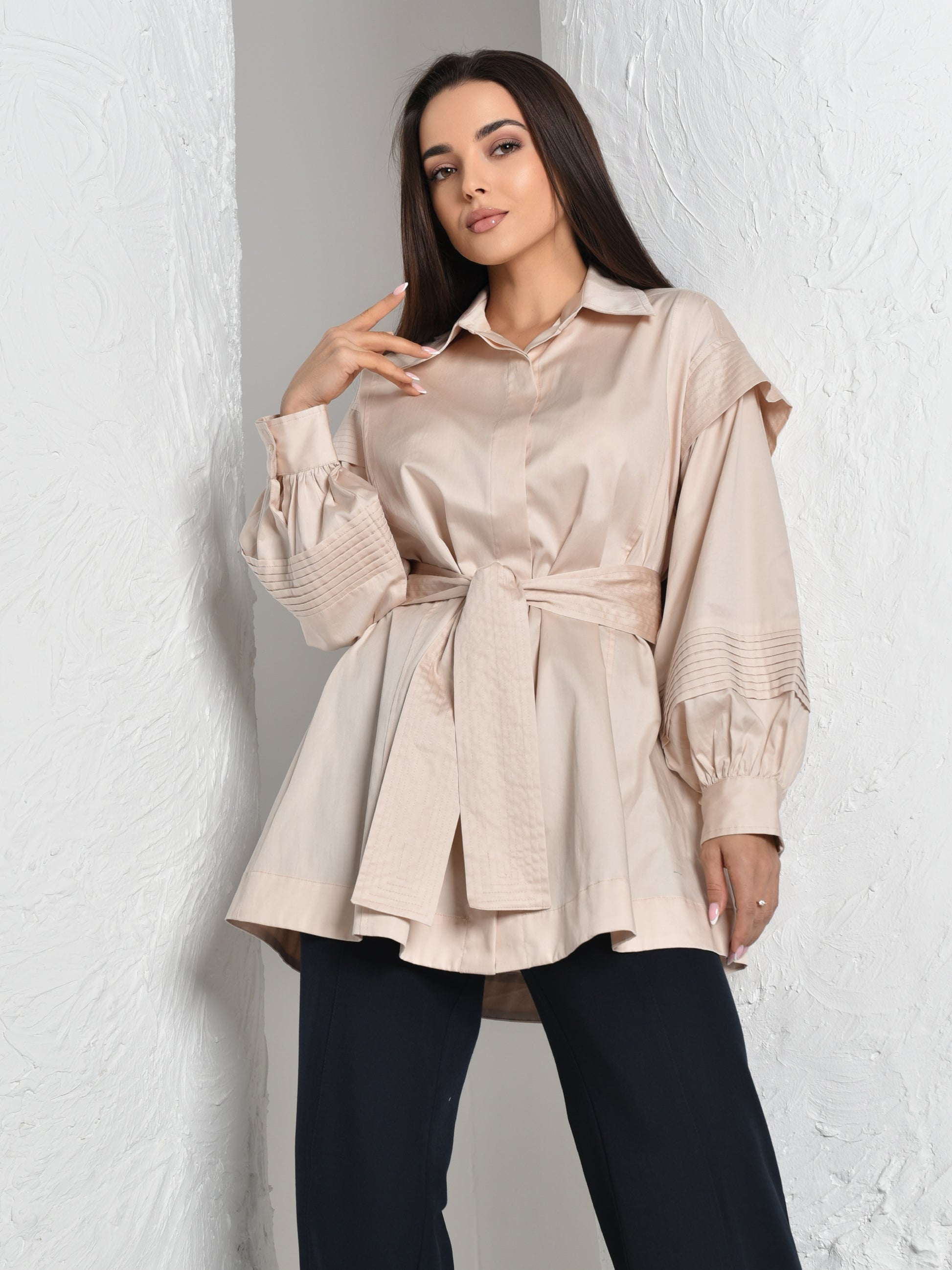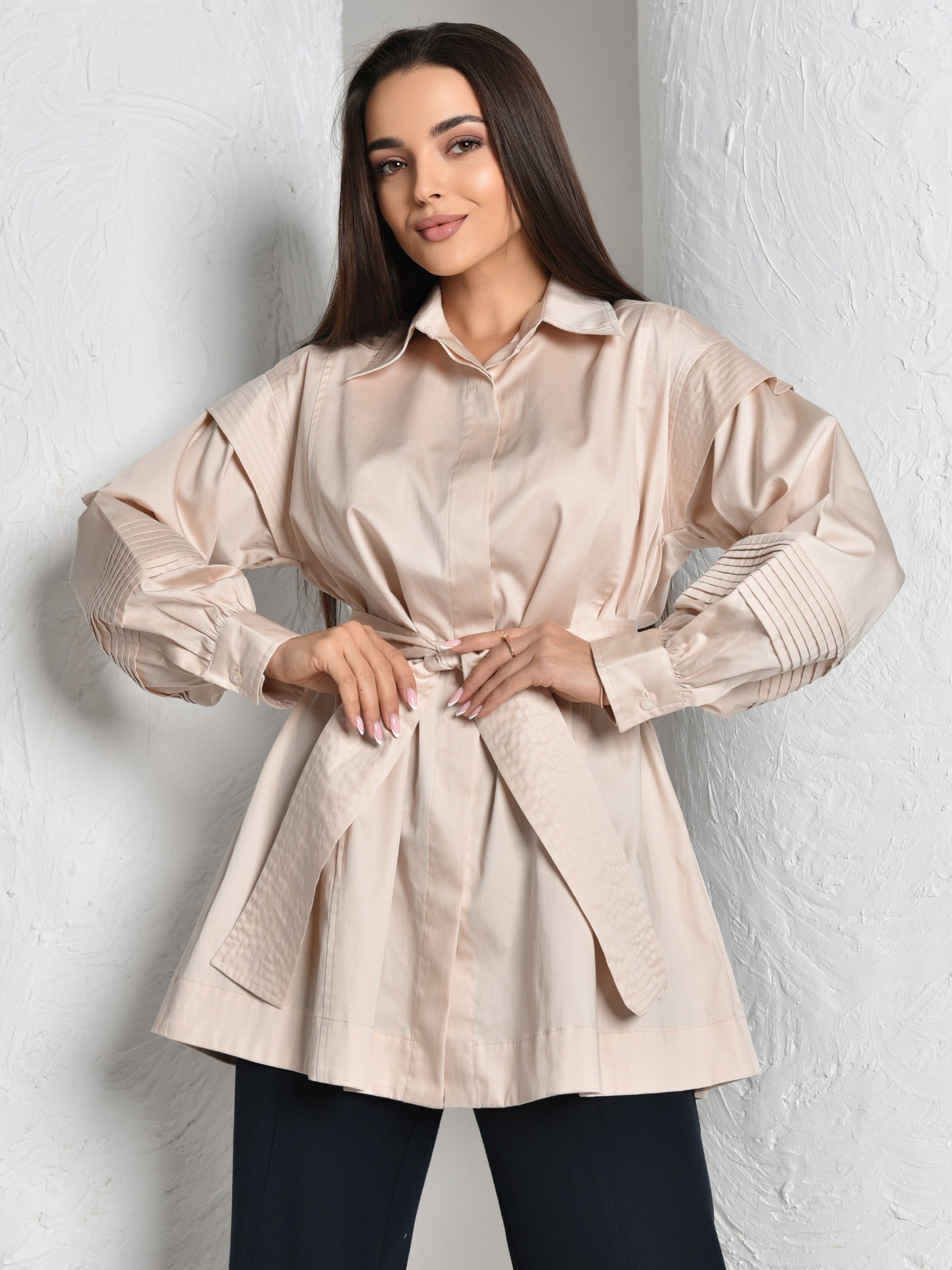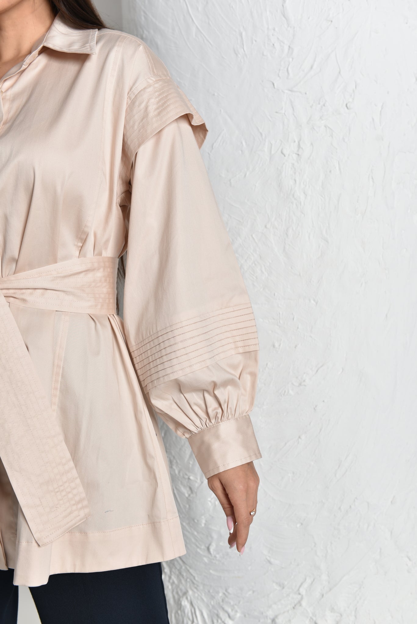 The easefully elegant oversized silhouette is expertly tailored in 100% cotton satin, and featuring a Plates on the shoulder and sleeves, with belt.