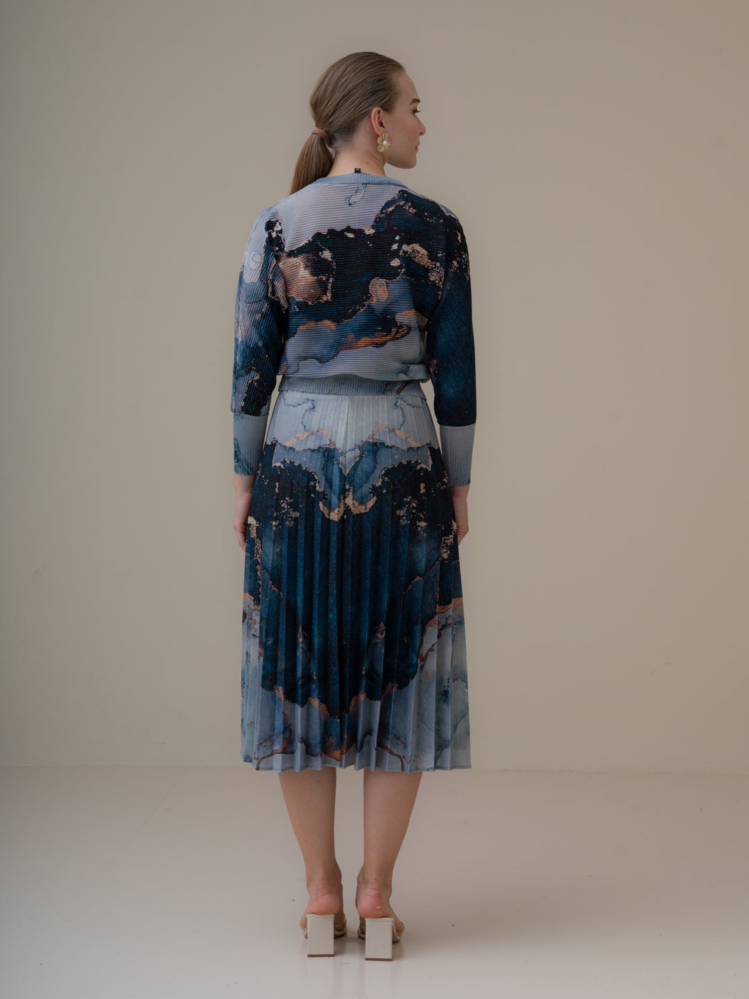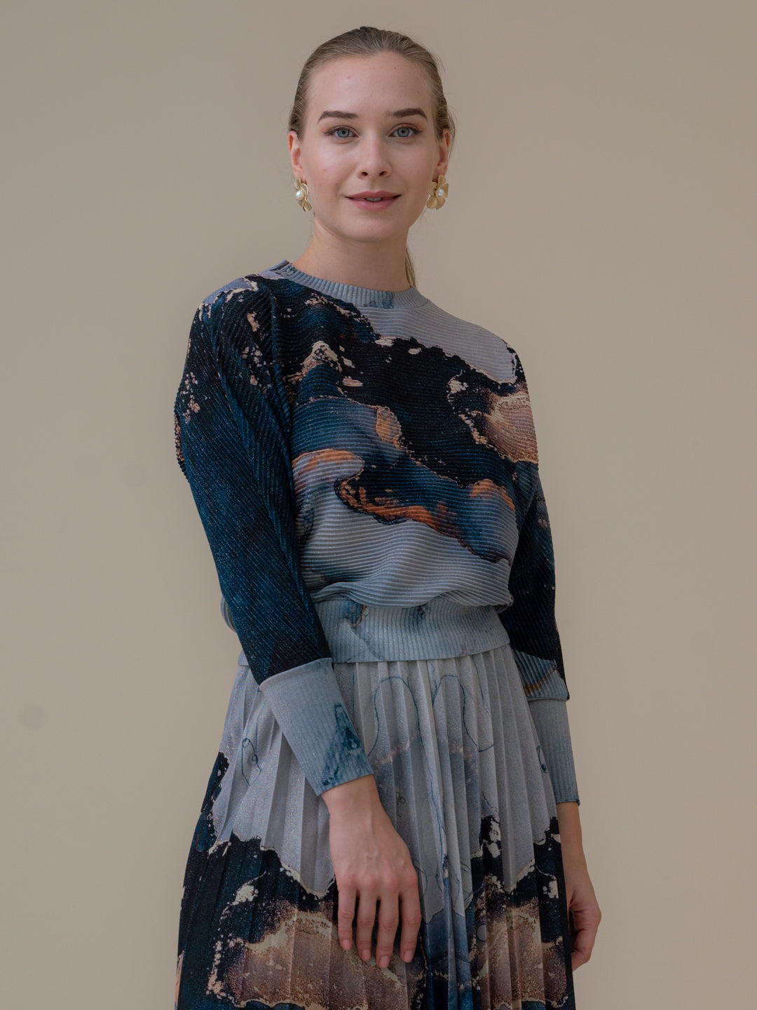 Timeless elegance defines this set from Fall 22 collection. The effortlessly feminine A-line midi design for the skirt is crafted from Gold Metallic Knit fabric that has a luxuriously glossy finish and is pleated to create a fluid swishy motion as you walk, with matching Blouse from the same fabric.