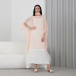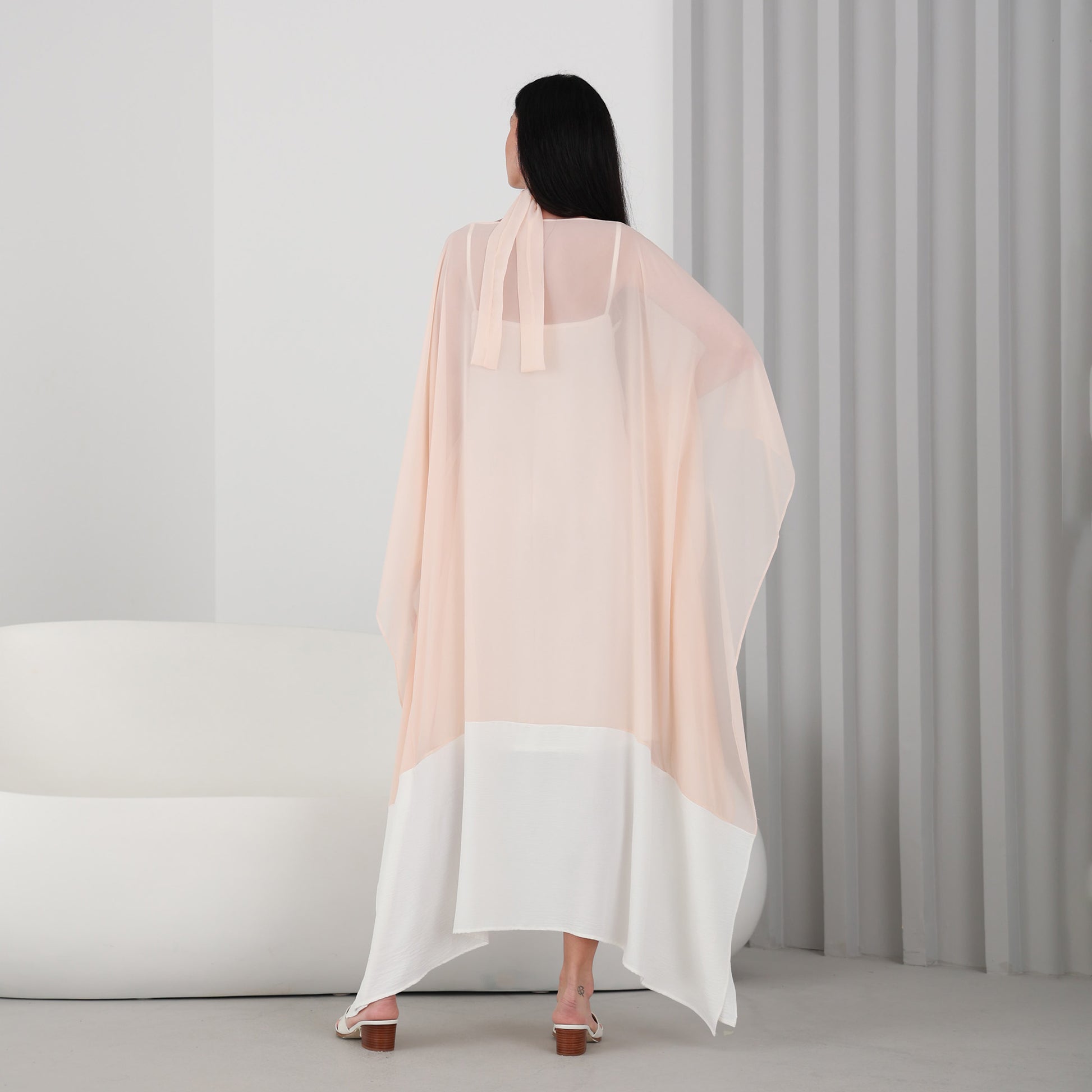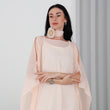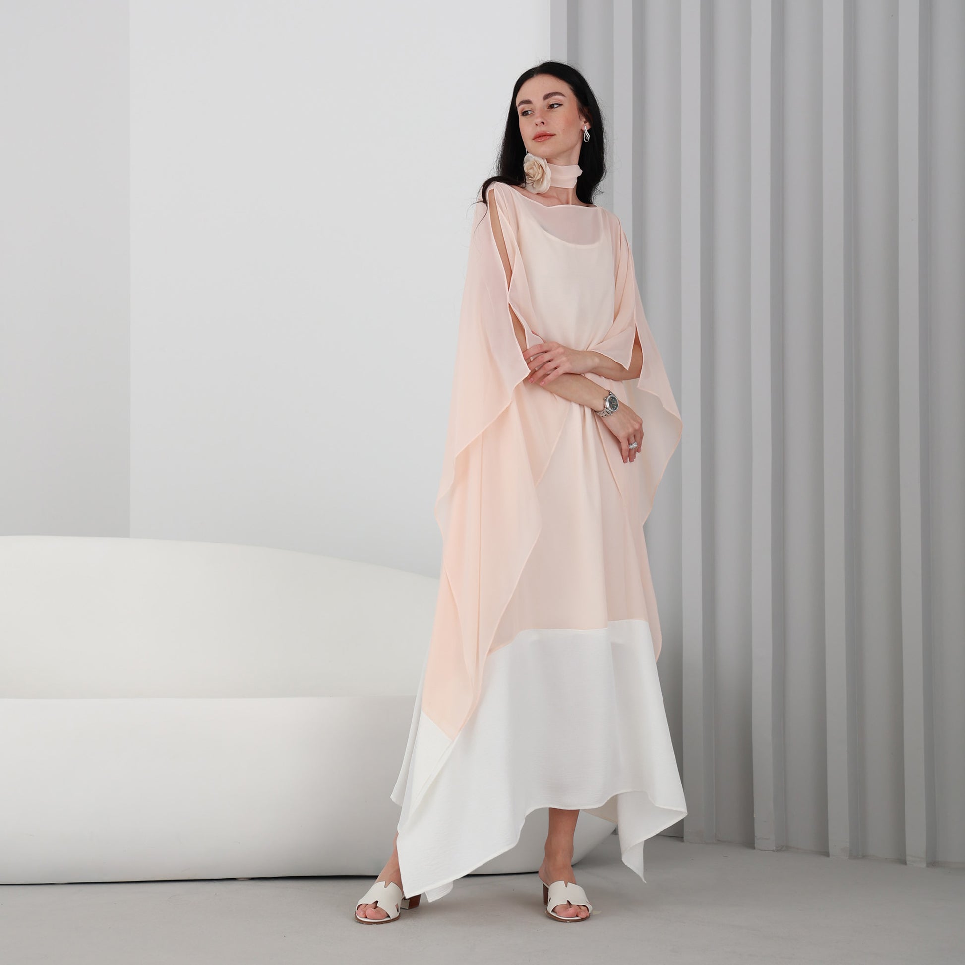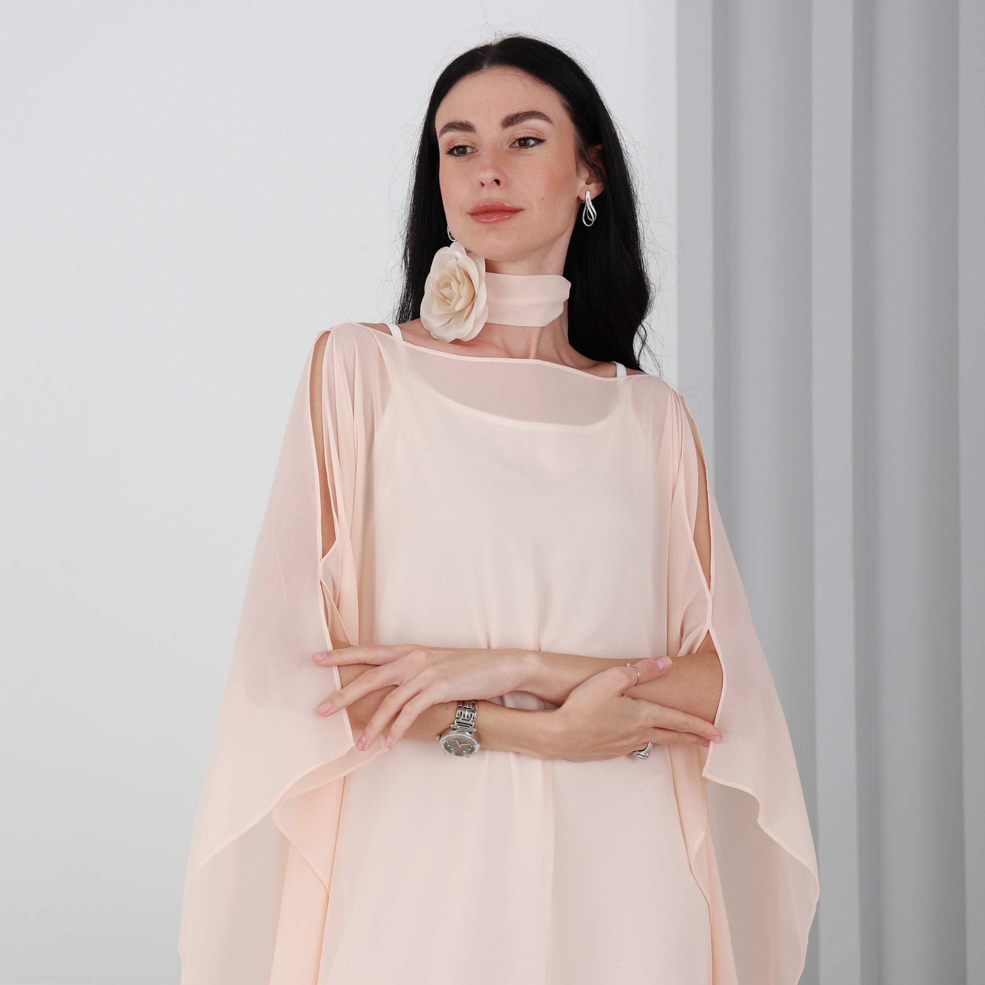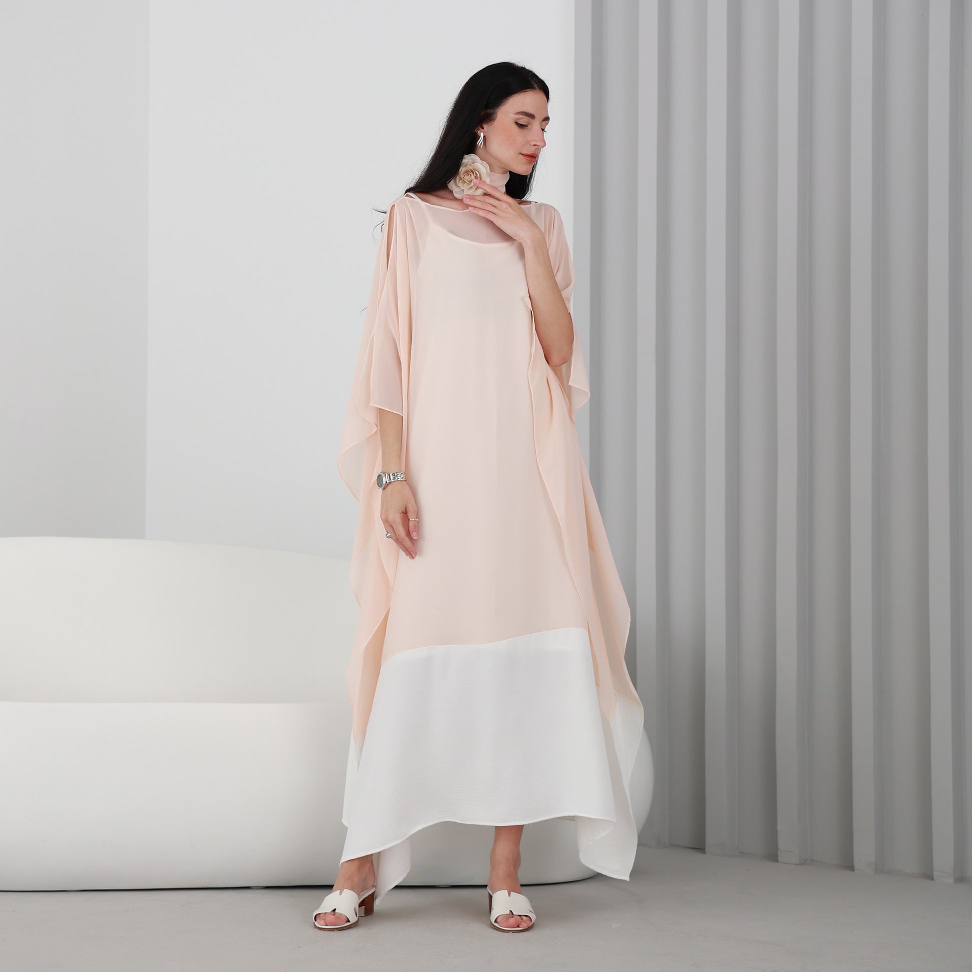 Lili Kaftan is a stunning piece that is perfect for any occasion. This kaftan dress features a beautiful Millennial Pink chiffon fabric that flows gracefully as you move. The dress comes with an attached under dress to ensure full coverage.