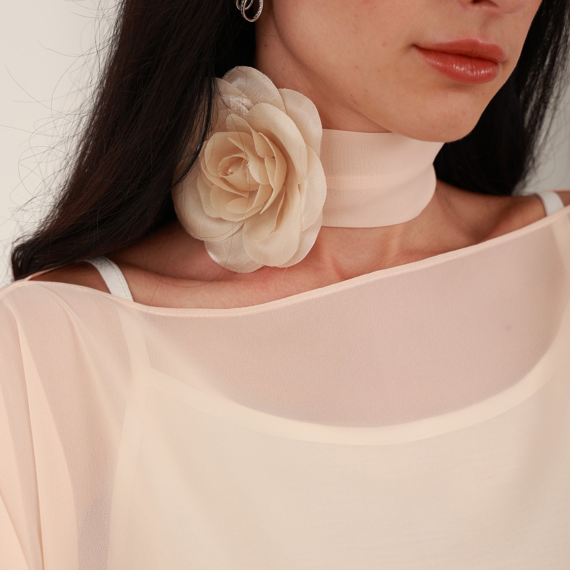 The dress also features a lovely flower choker on the neck that adds a touch of elegance to the overall design. The flower choker is made of Chiffon fabric that complements the dress perfectly.