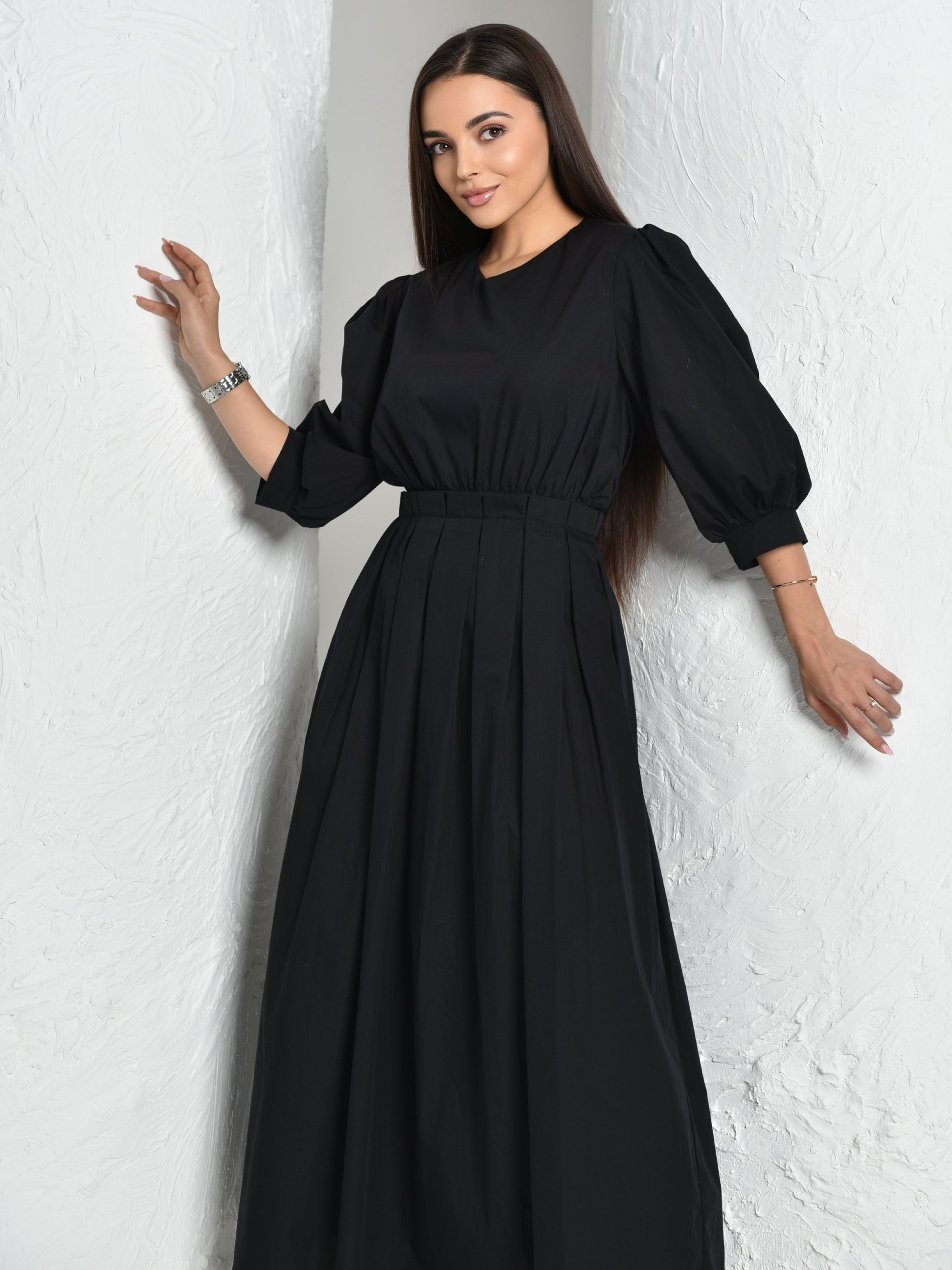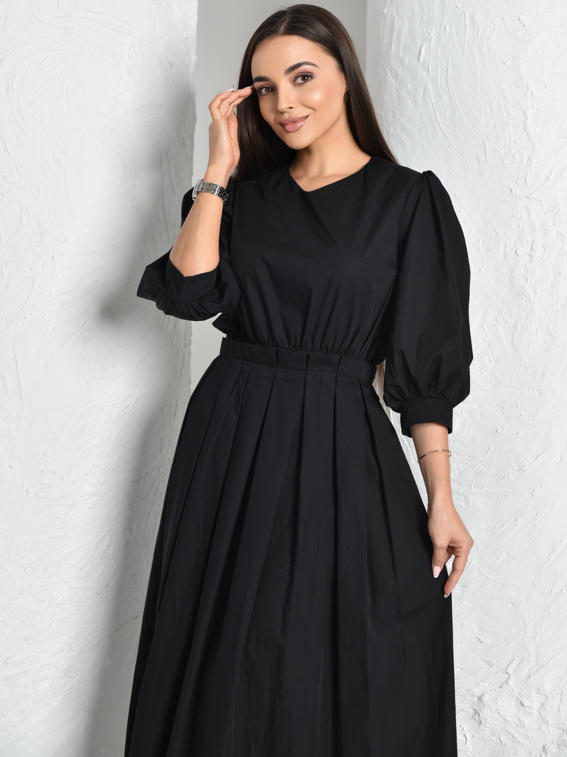 Pleated on the waist line to reflect the elegancy, v neck with Zip-back fastening.