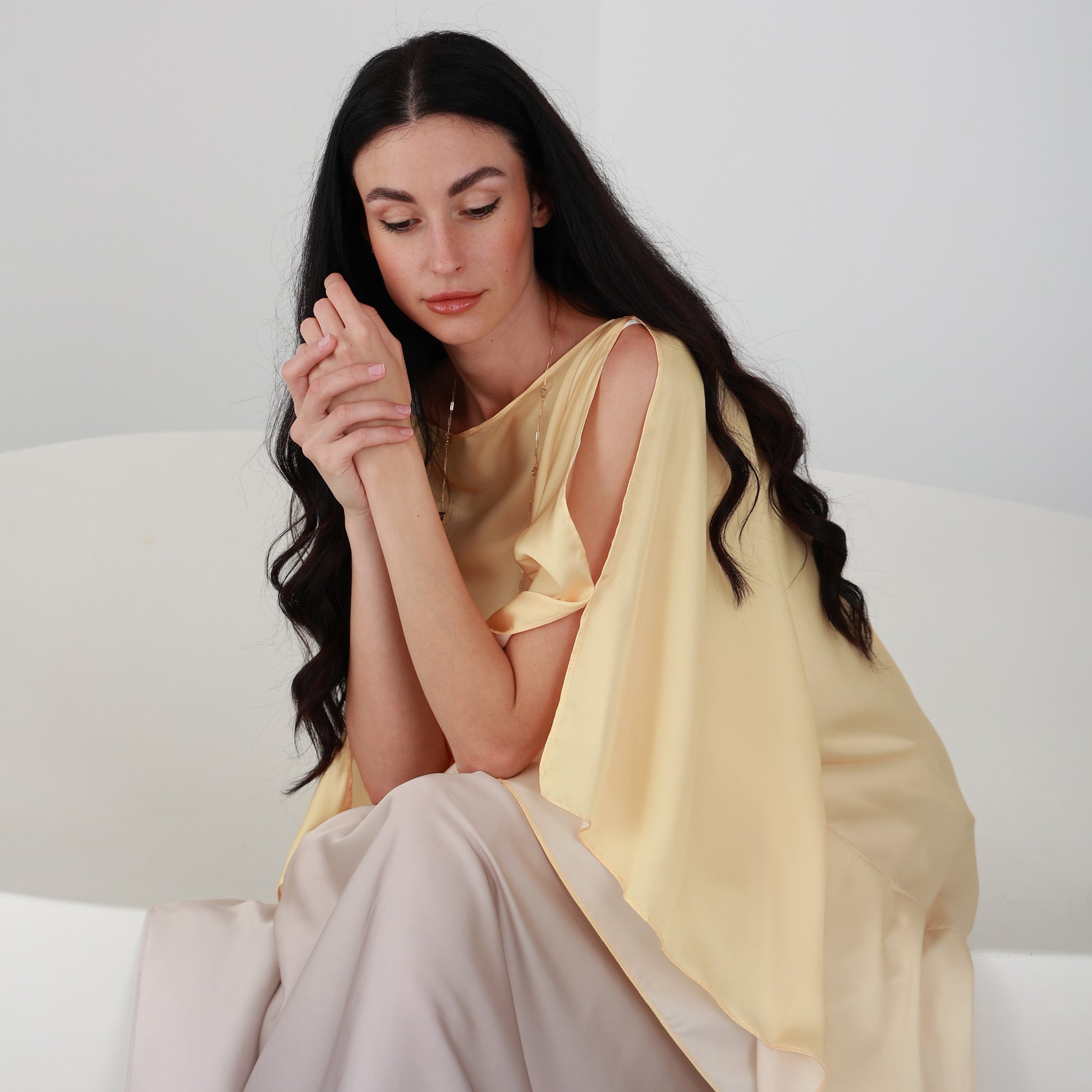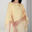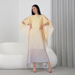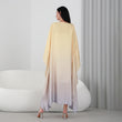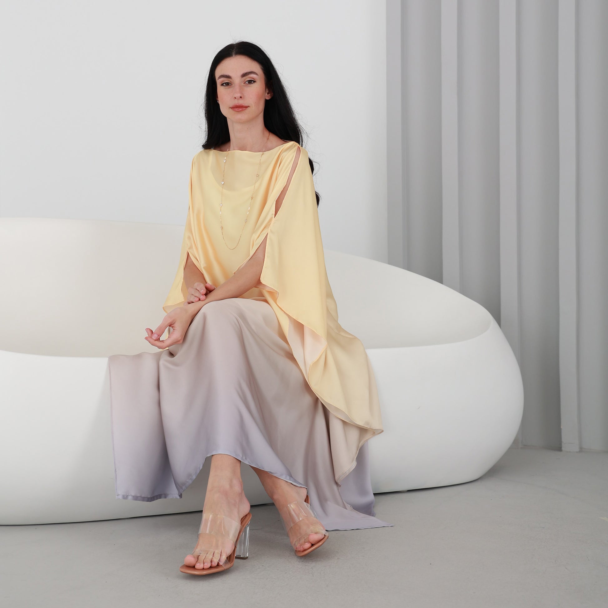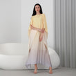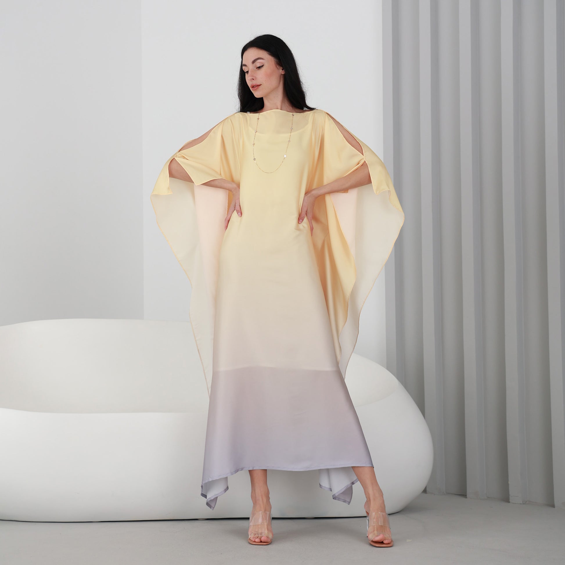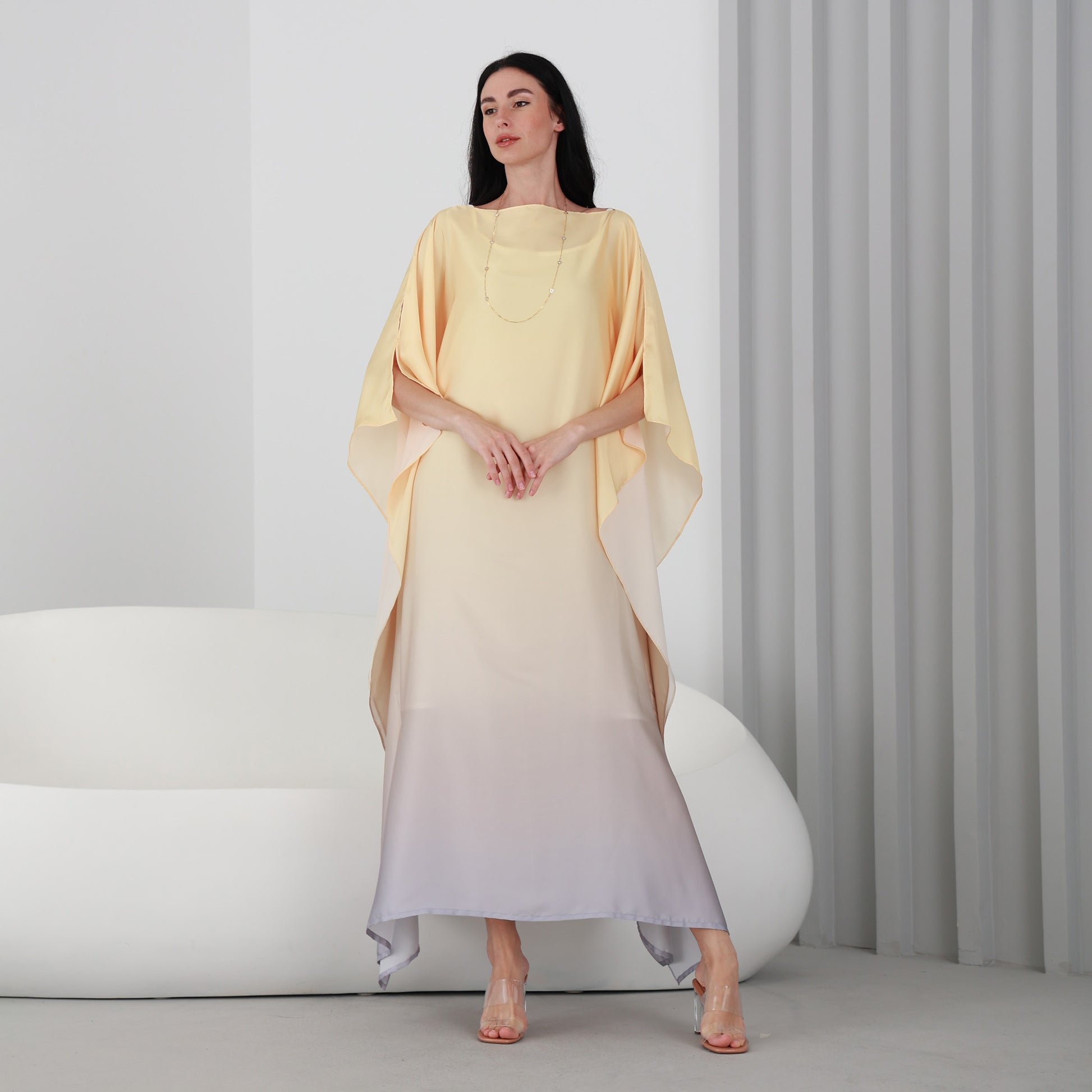 Muhra kaftan features a loose and flowy silhouette, with a straight neckline and wide sleeves that add to its relaxed and easy-going vibe. The Yellow Ombre color is soft and refreshing, creating a sophisticated and feminine look. The lightweight chiffon silk material drapes beautifully and is perfect for warm weather, while the oversized design ensures that you stay comfortable and relaxed. You can pair it with some heels and jewelry for a more formal occasion. Overall, this kaftan is a versatile and chic addition to any wardrobe. Its unique design can be Worn in 2 ways